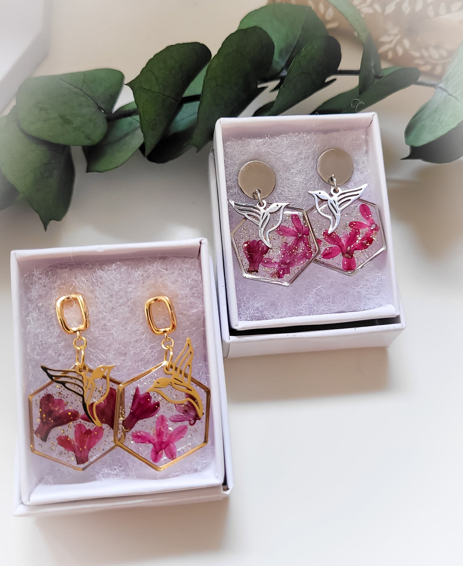 Boucles d'oreilles avec fleurs sèchées de différentes couleurs.