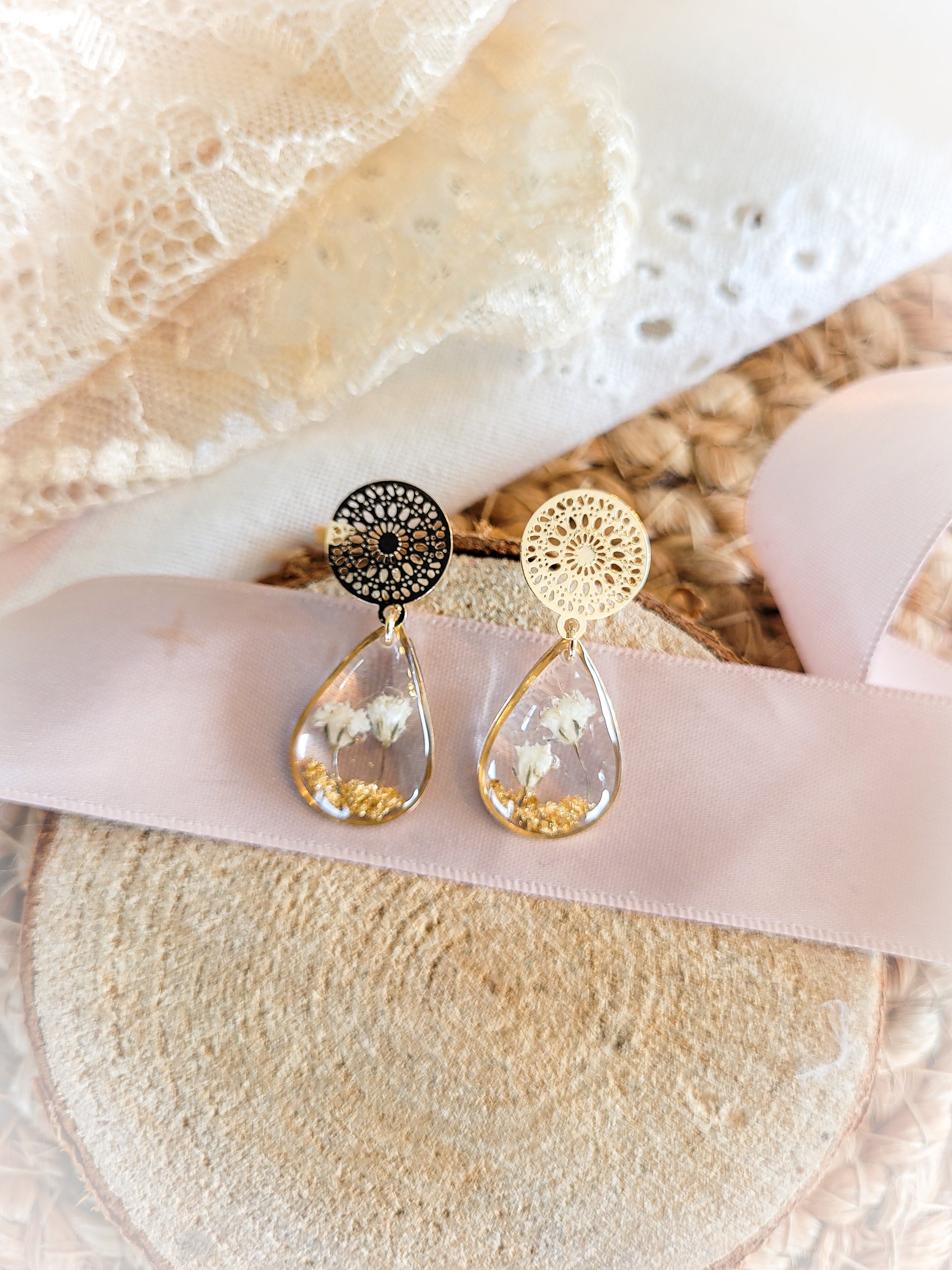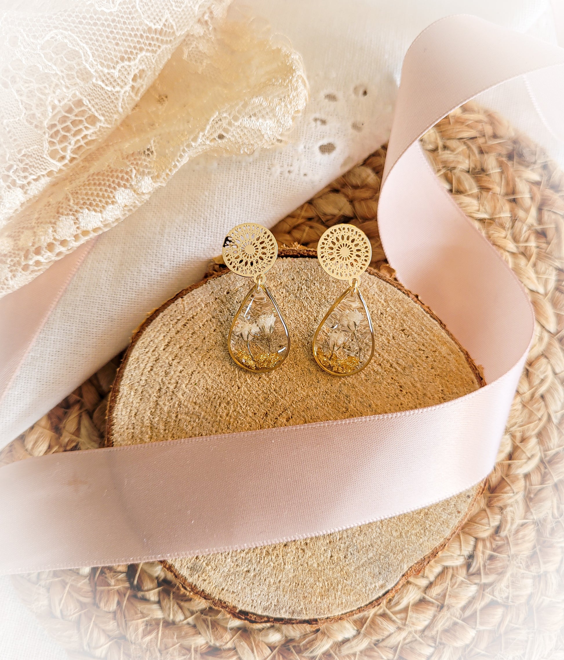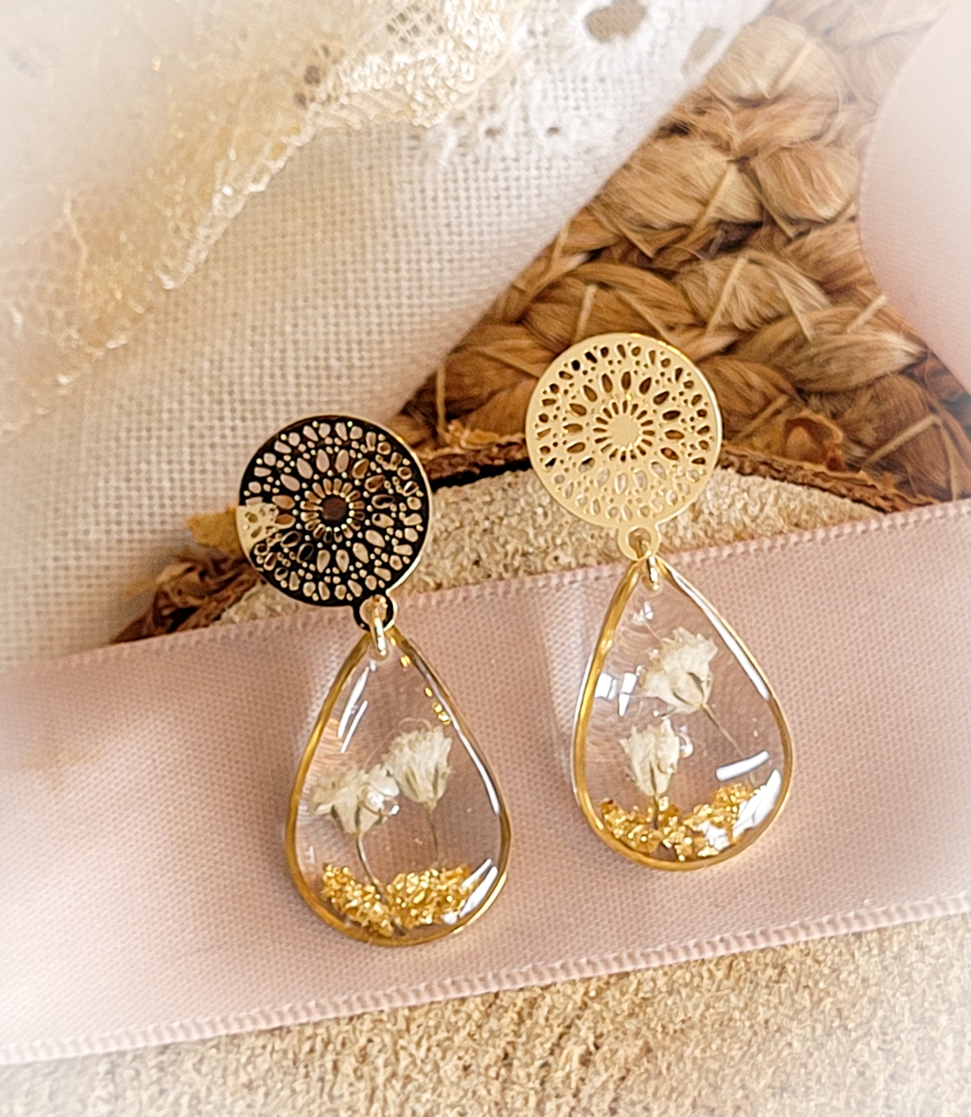 The Amaya earrings are composed of a drop pendant in which are encrusted white gypsophila flowers and gold sequins.