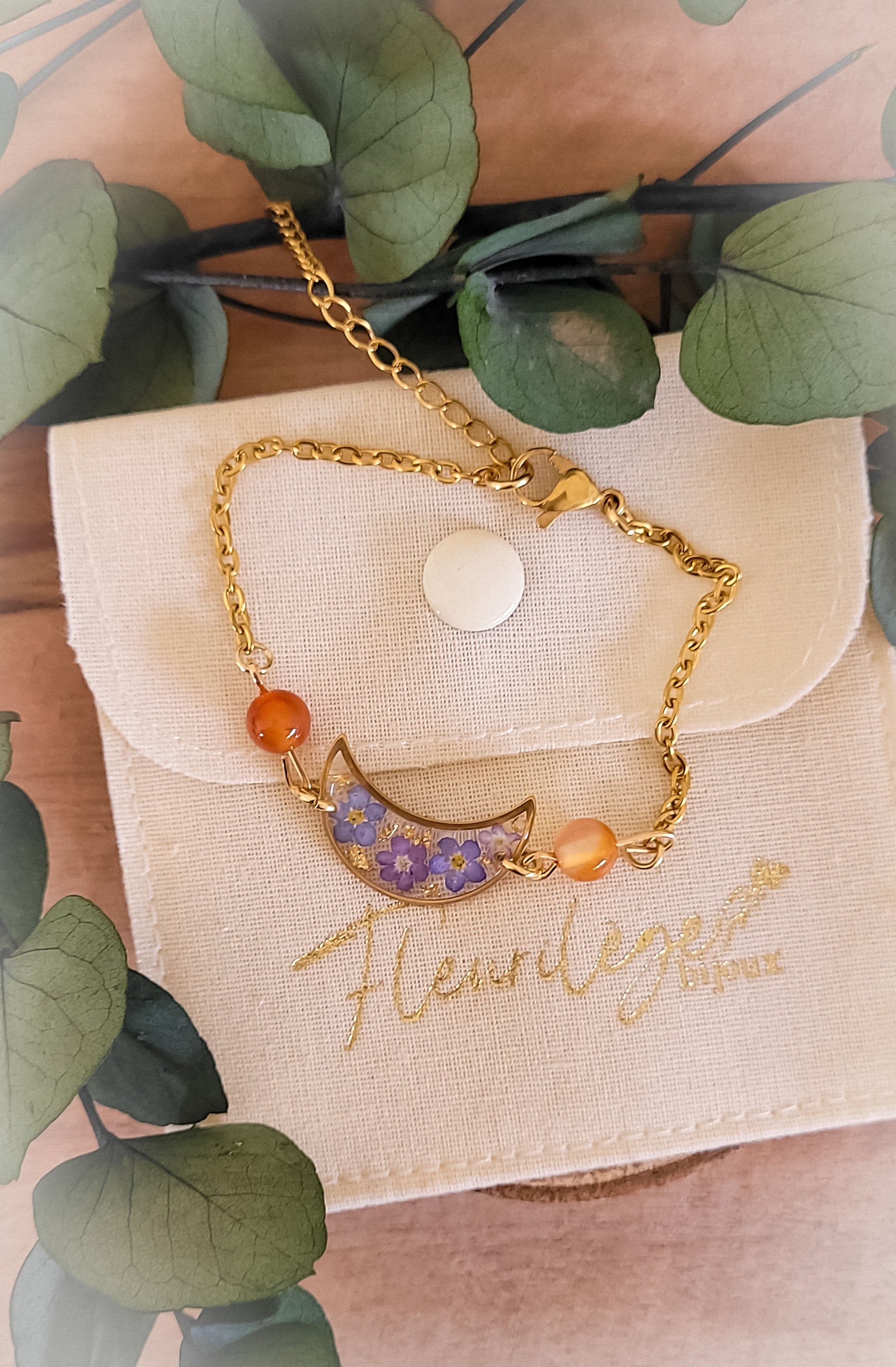 Pendentif lune avec fleurs de myosotis.