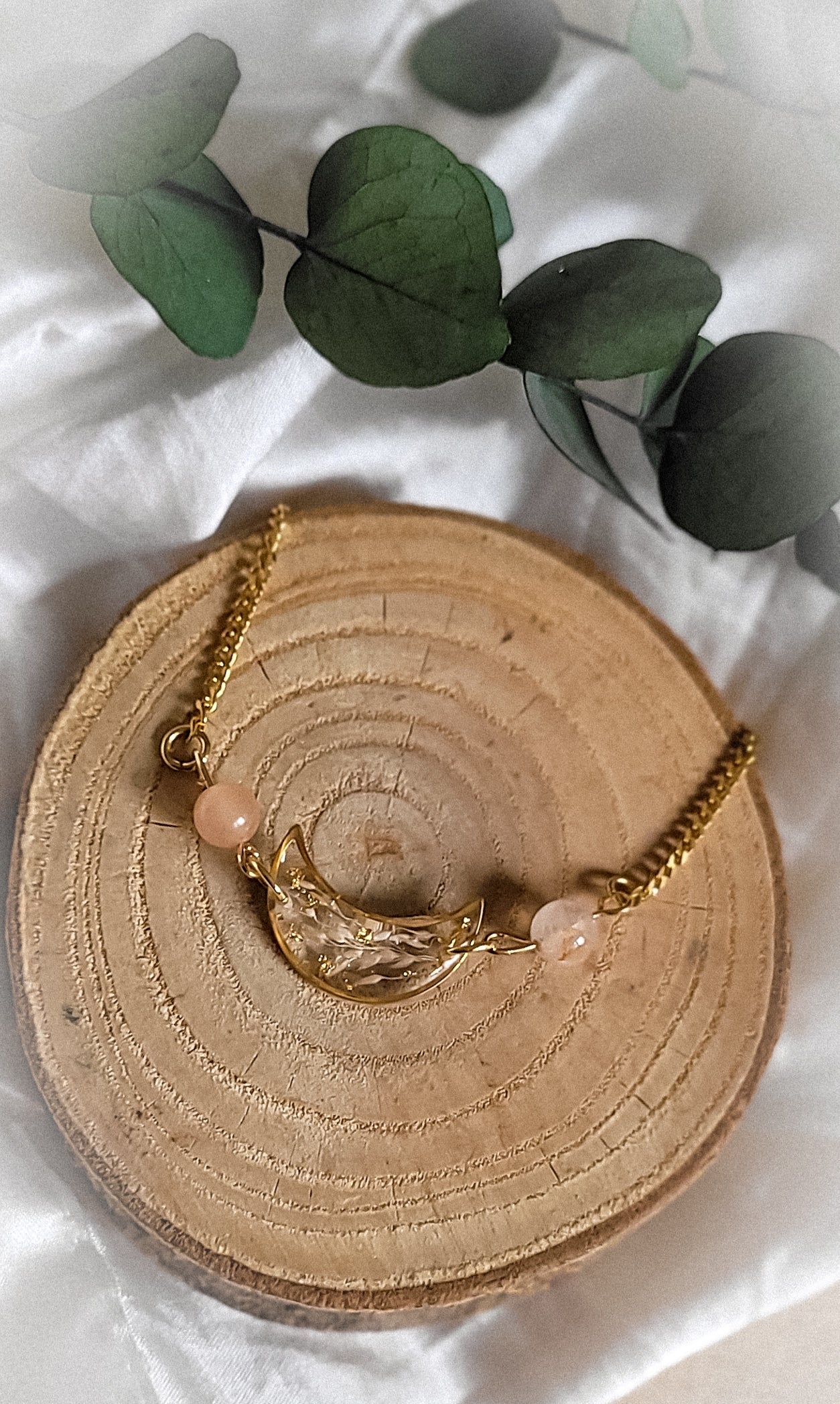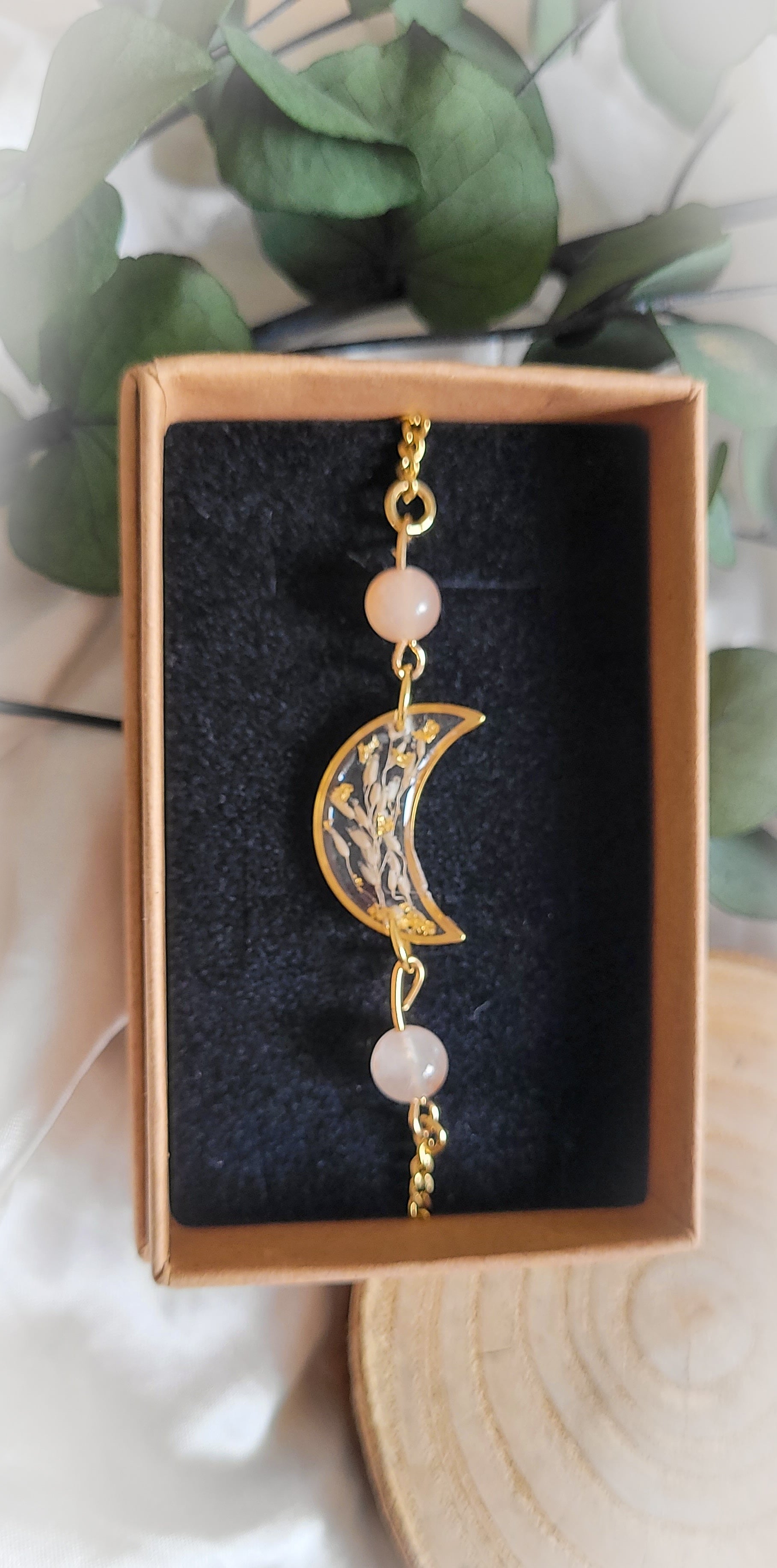Pendentif lune avec inclusion de fleurs sèchées de stargrass et paillettes d'or.