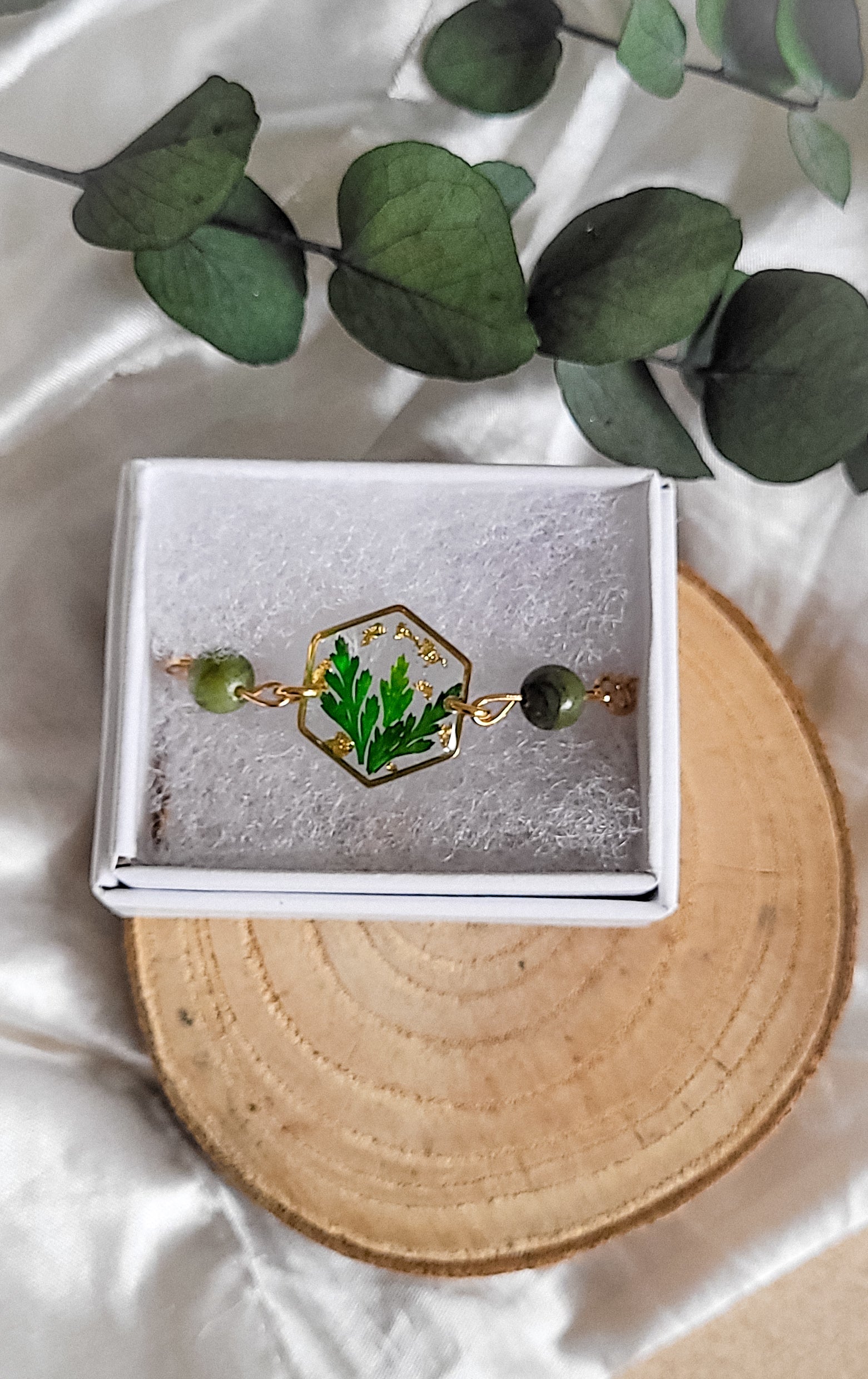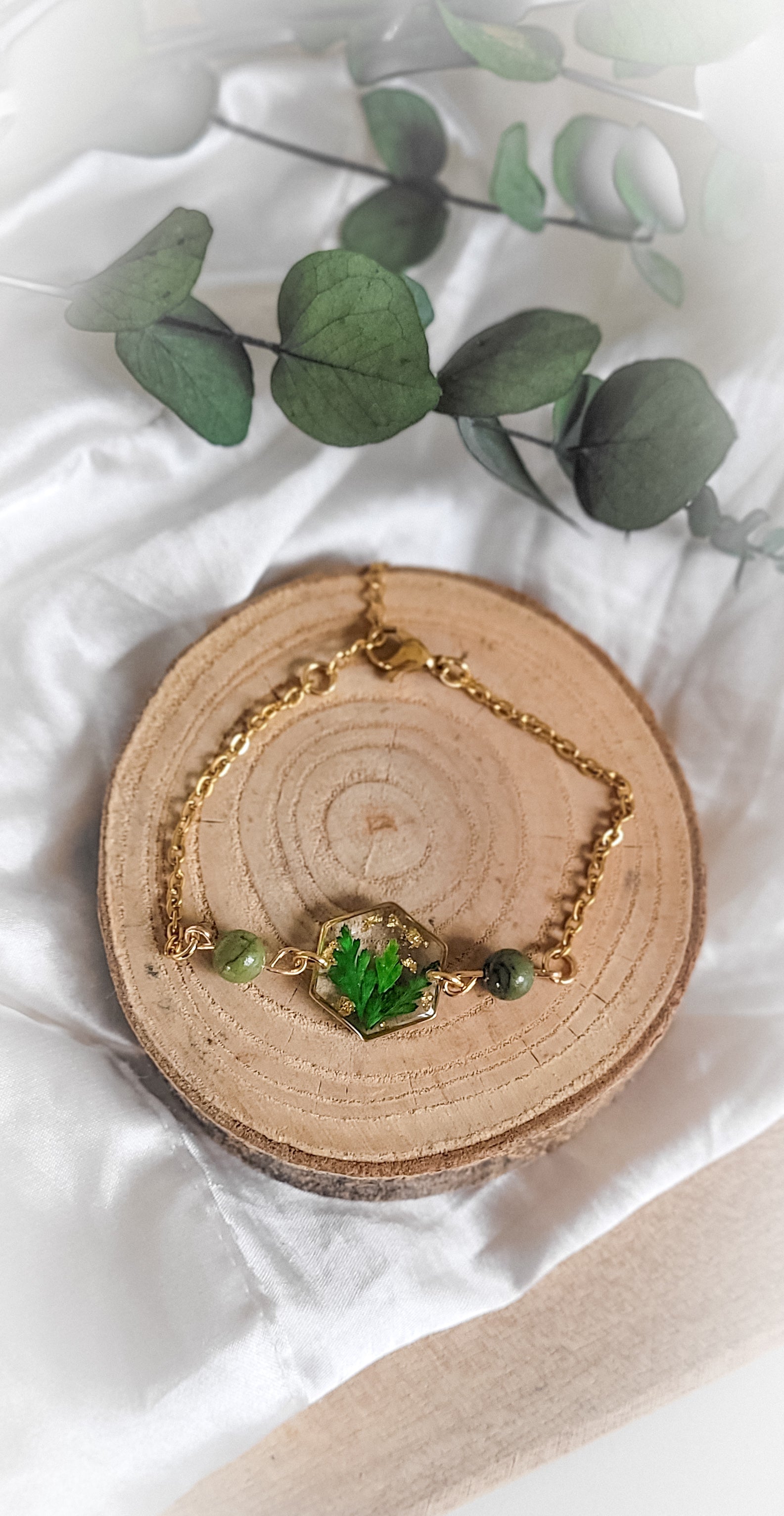 Pendentif hexagone avec inclusion de fougères et paillettes d'or.