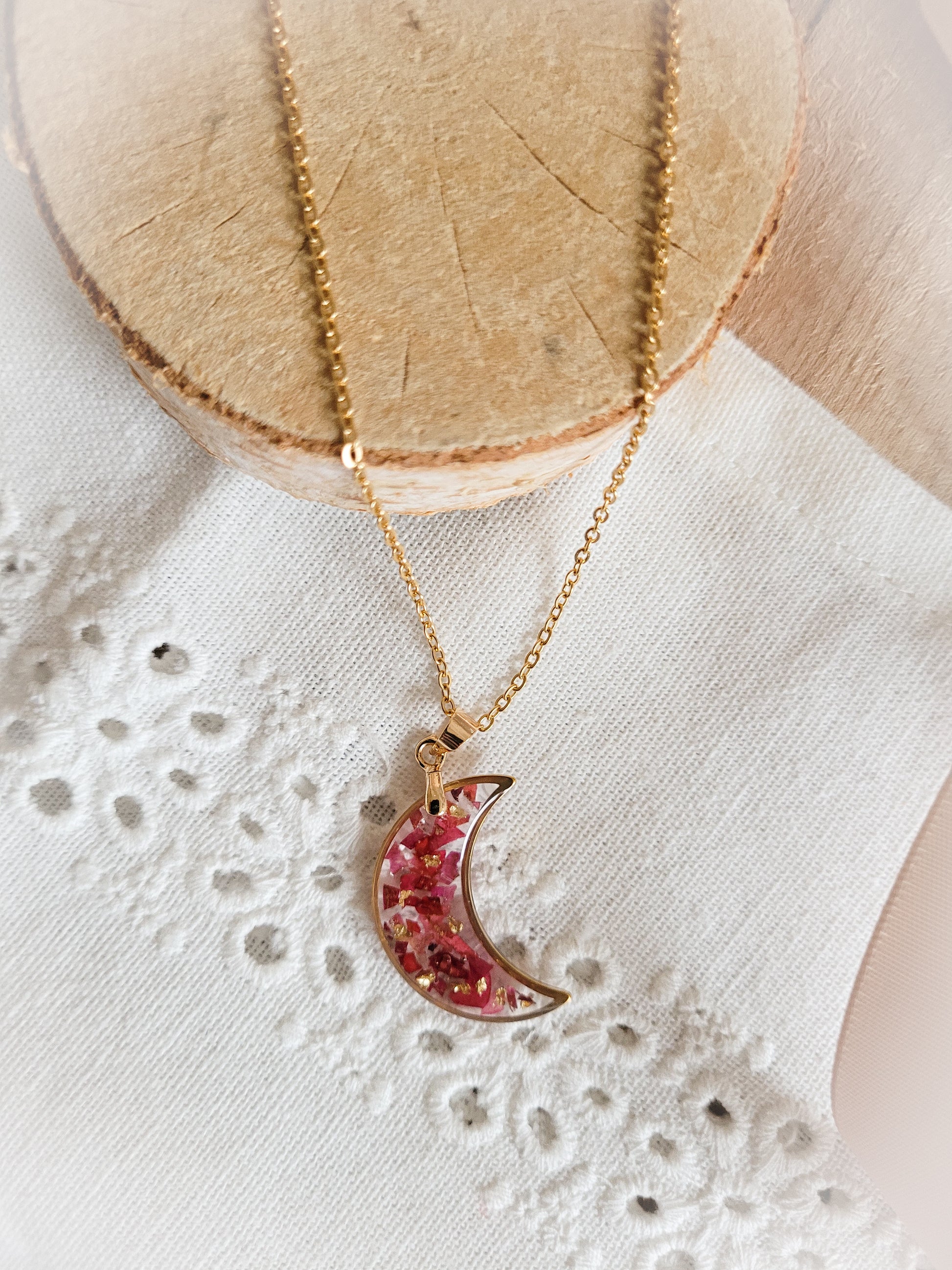 Gold plated chain necklace with moon pendant filled with resin in which are encrusted rose petals and a few gold leaves.