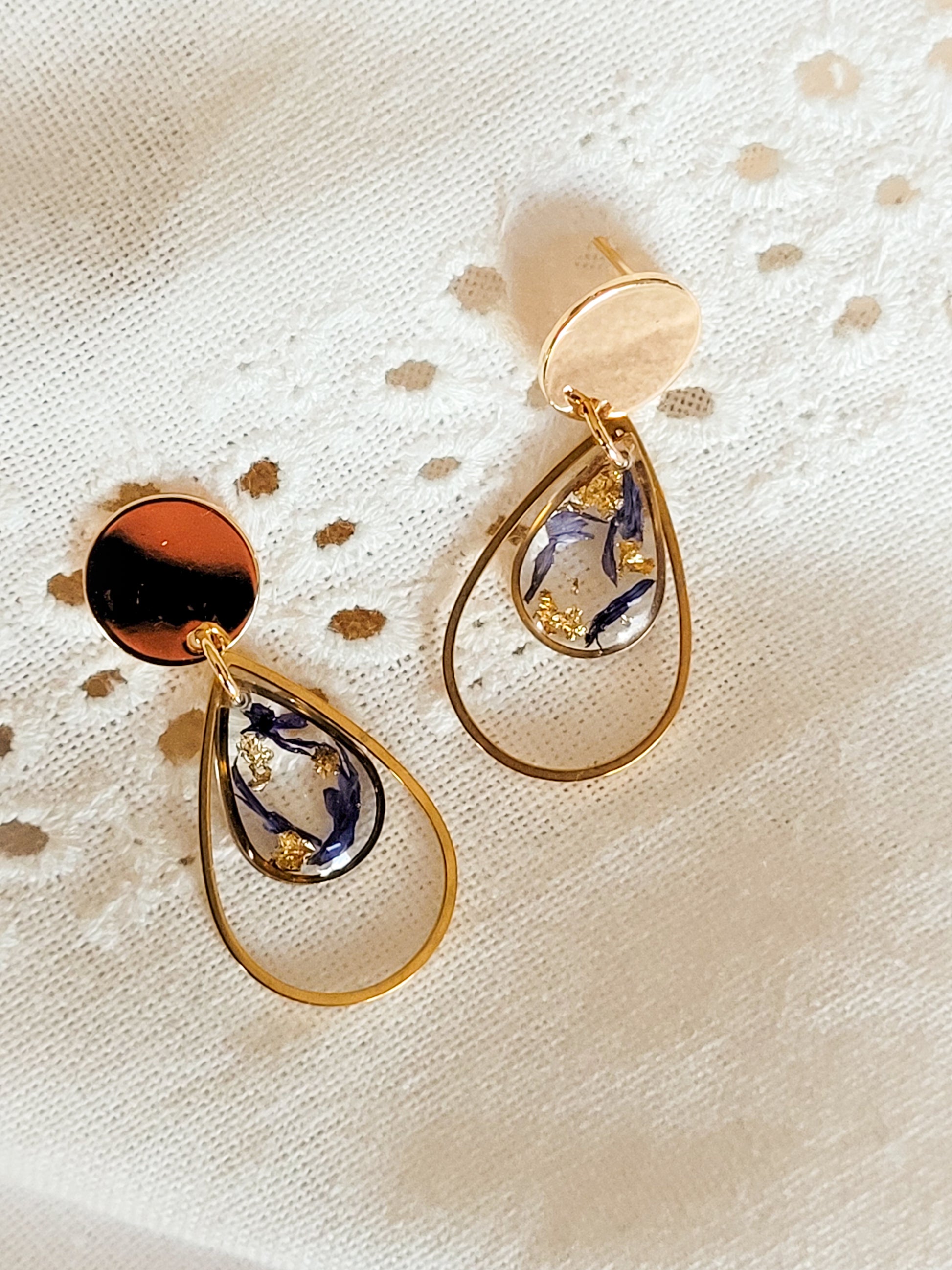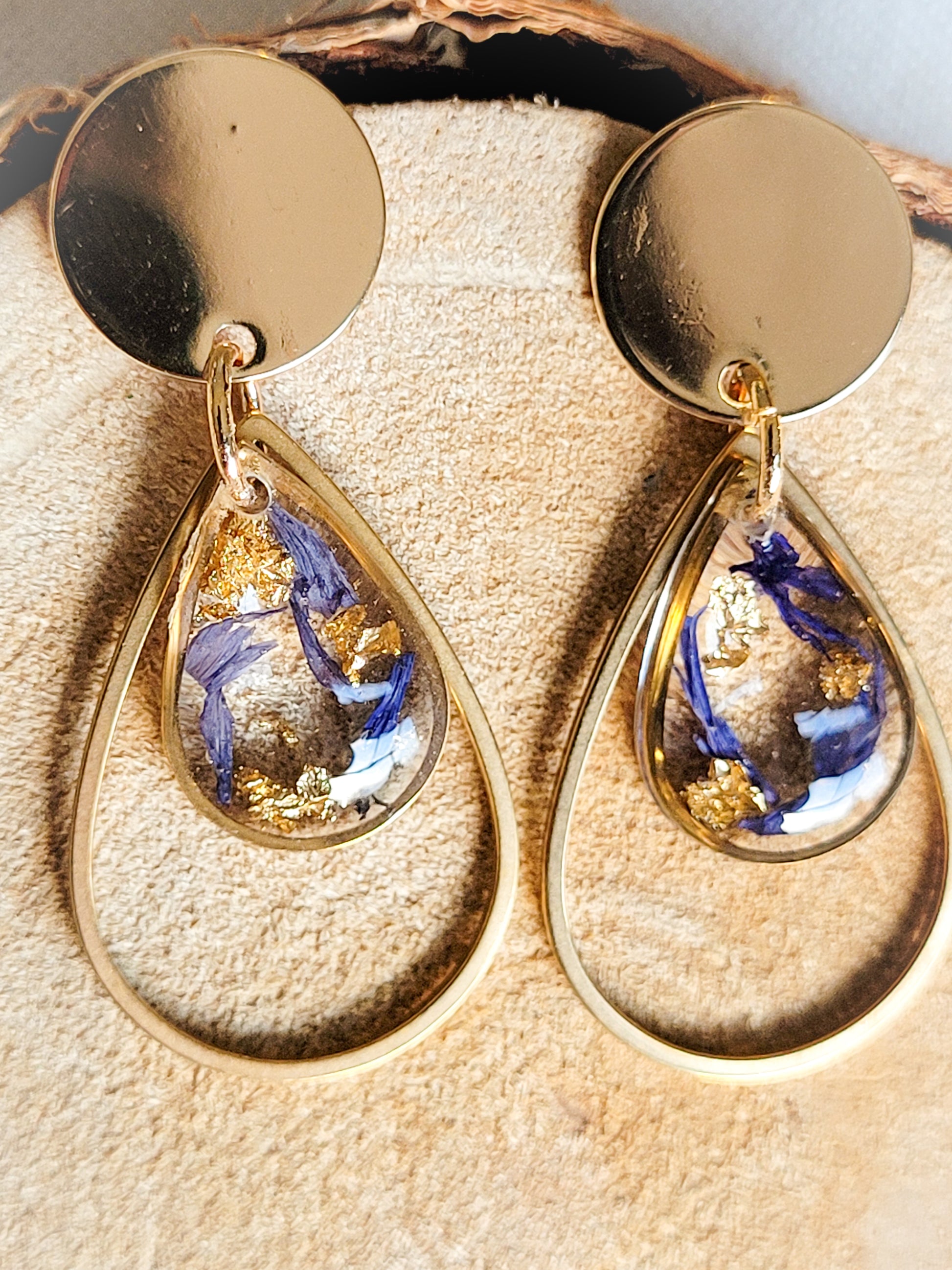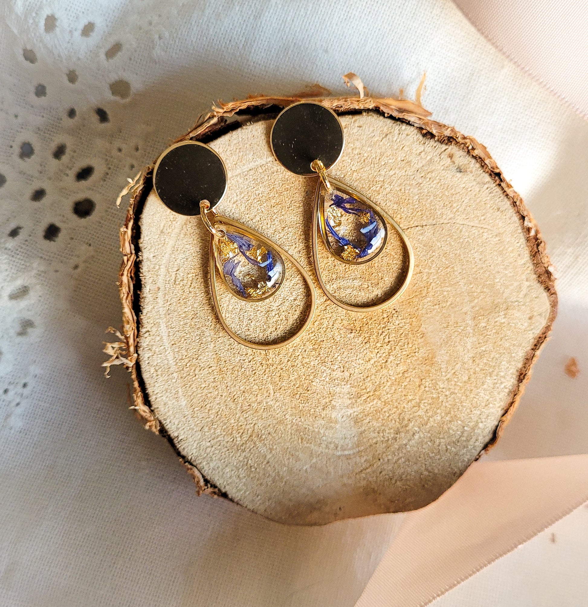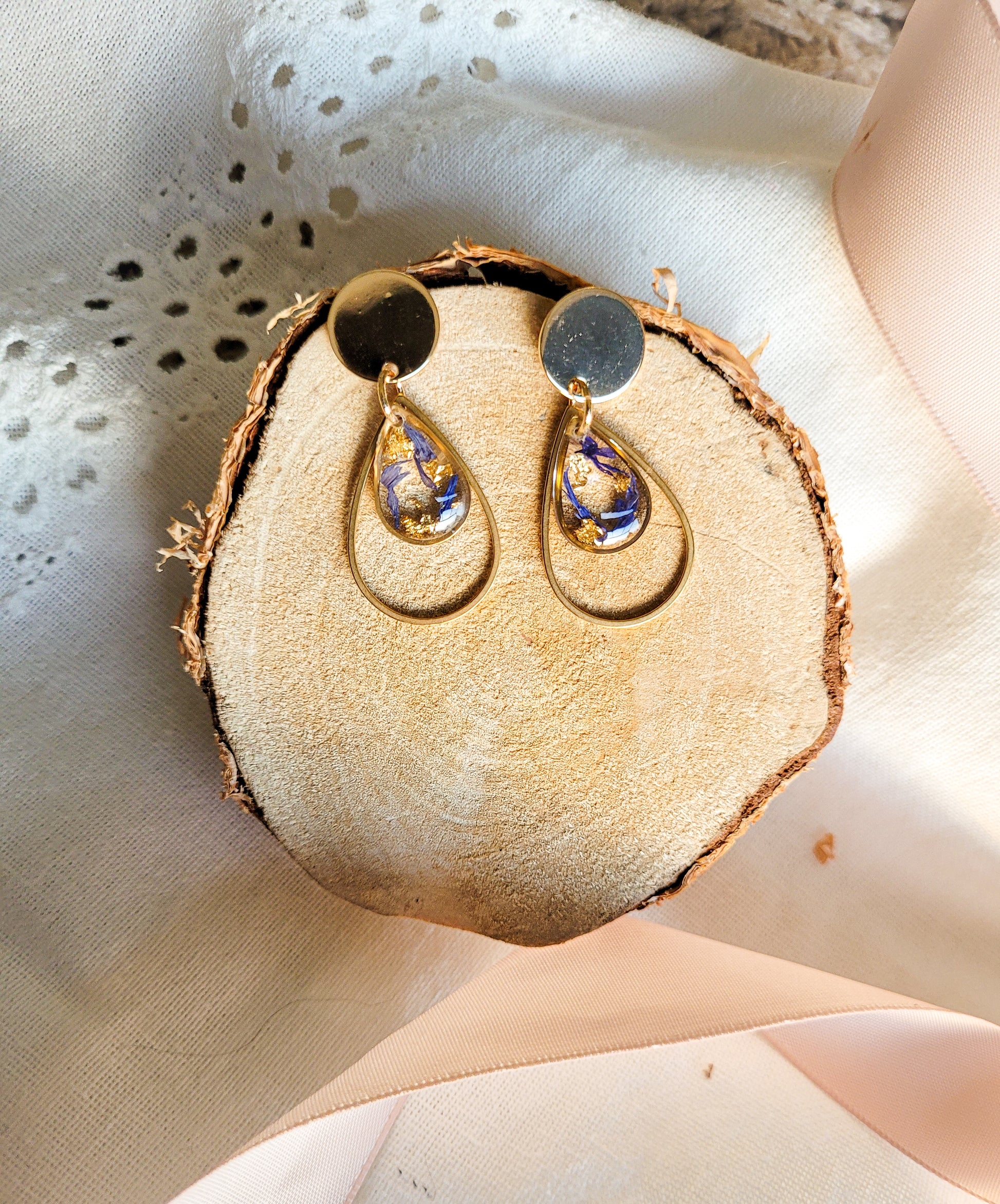 Earrings composed of drop pendants with inclusion of blueberry petals and gold sequins.