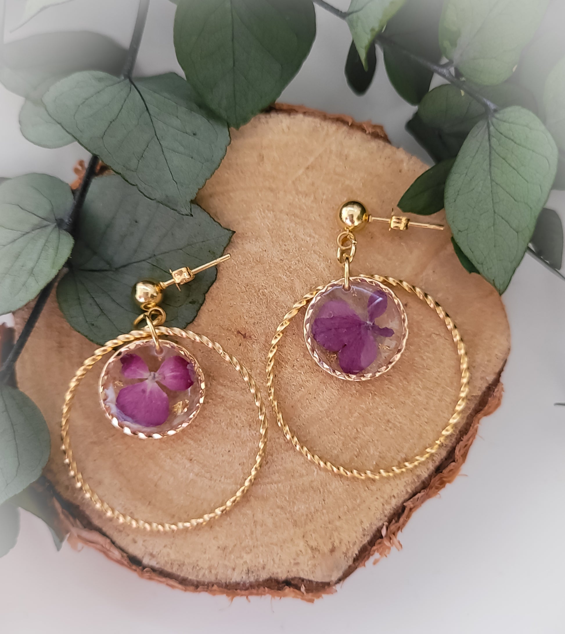 Boucles d'oreilles avec double anneaux et inclusion d'une fleur d'hortensia dans les tons roses/violets.