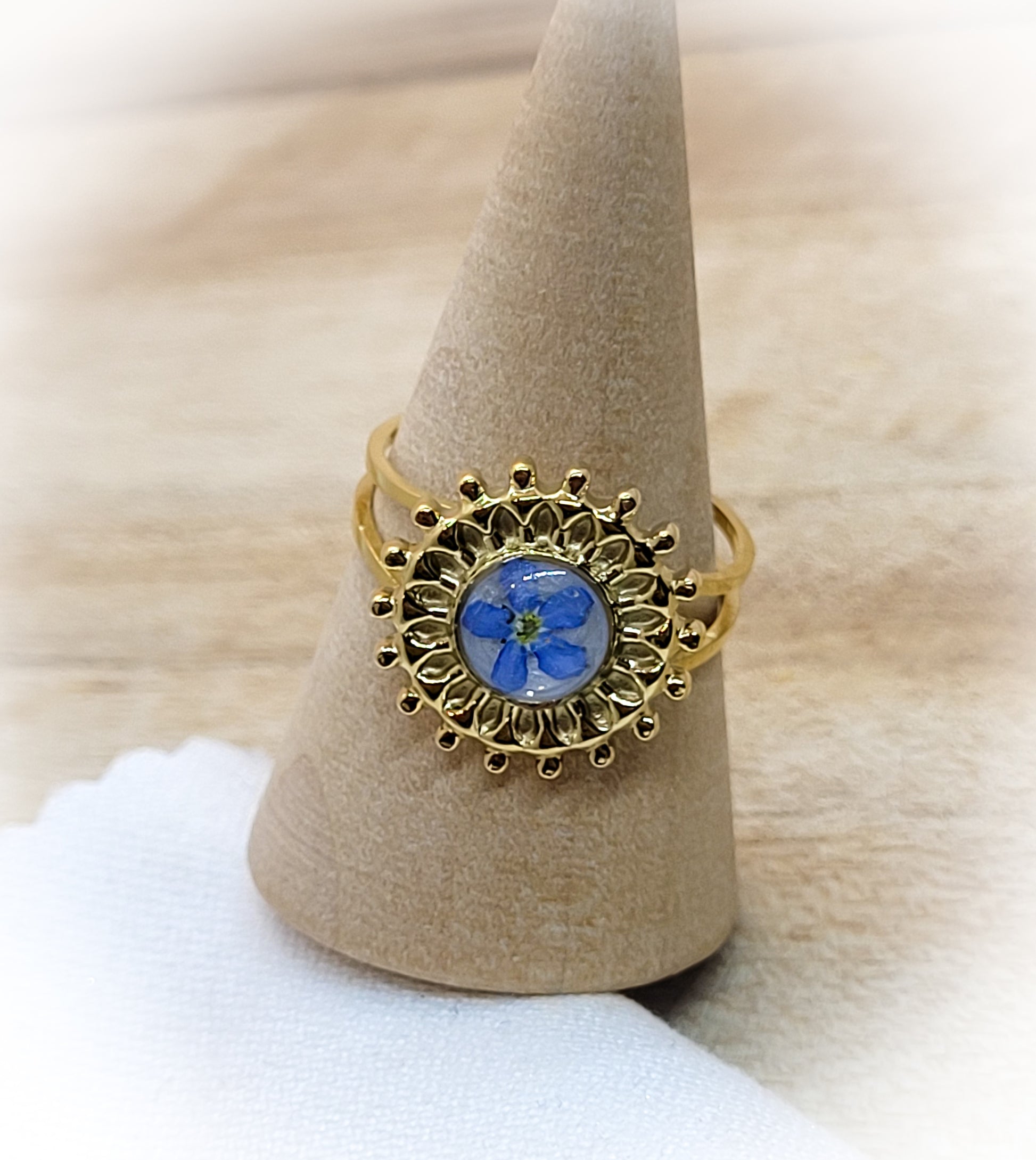 Adjustable stainless steel ring with forget-me-not flower.