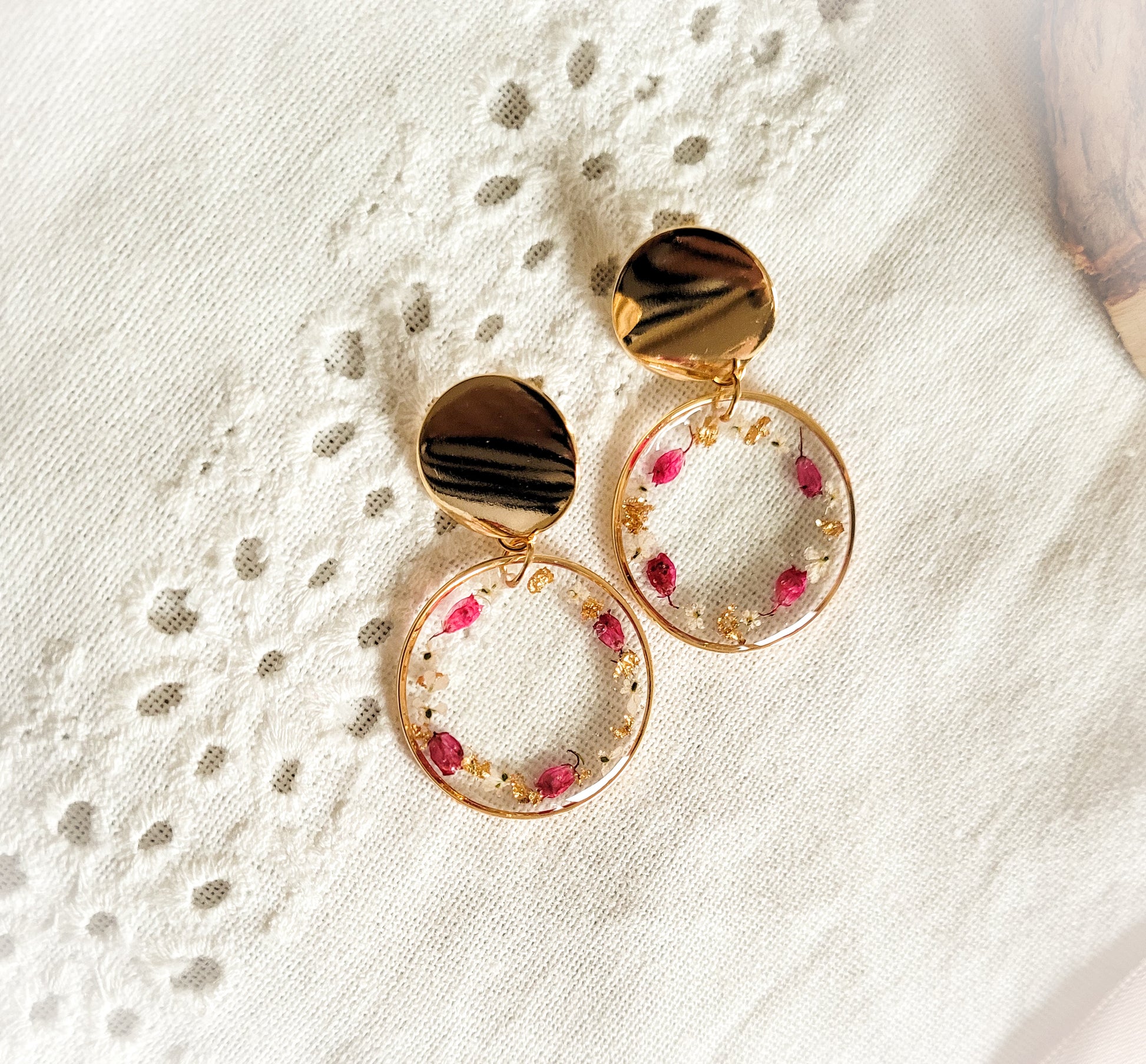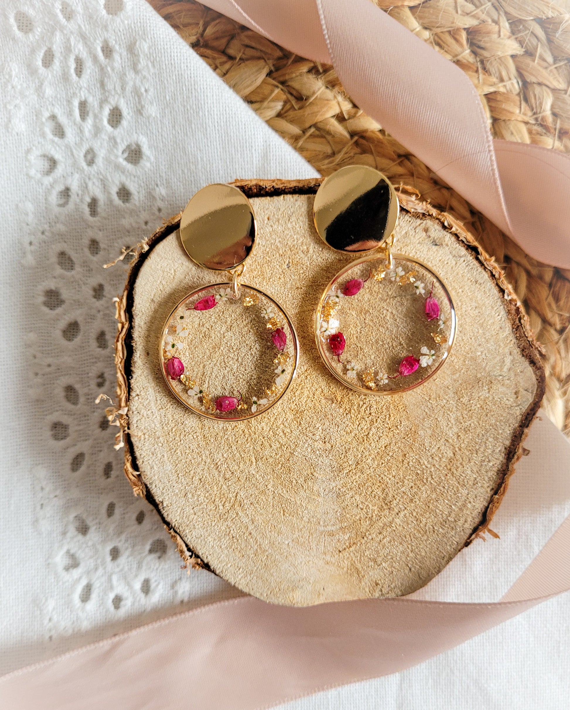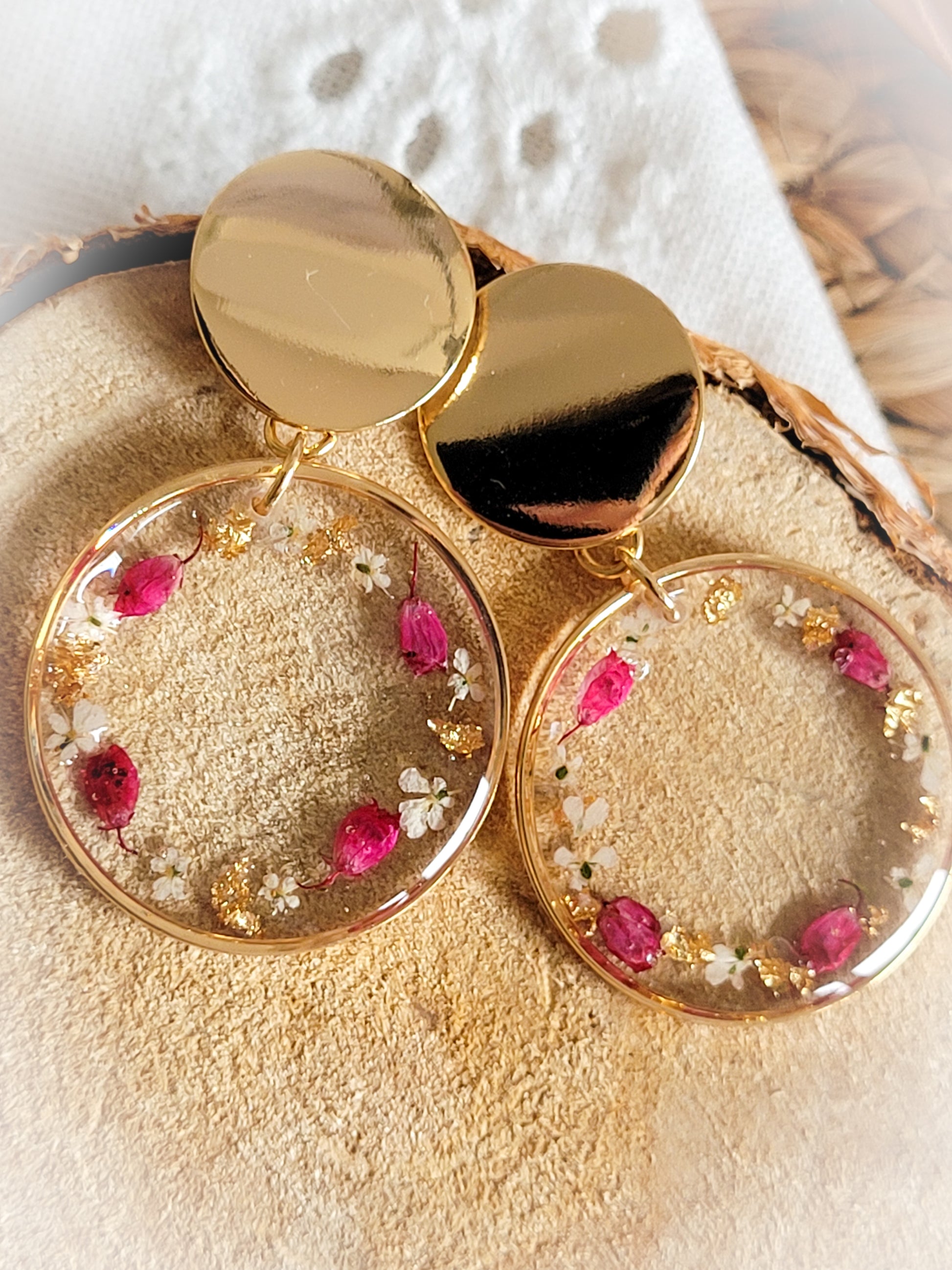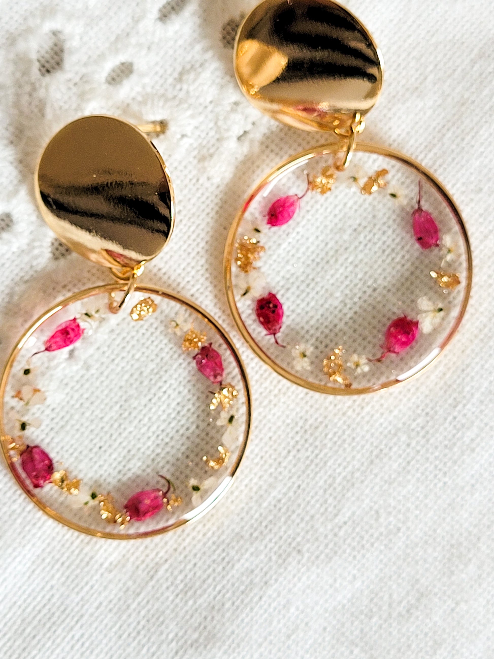 Pretty round earrings, composed of rings filled with resin in which are encrusted heather flowers and Queen Anne lace.