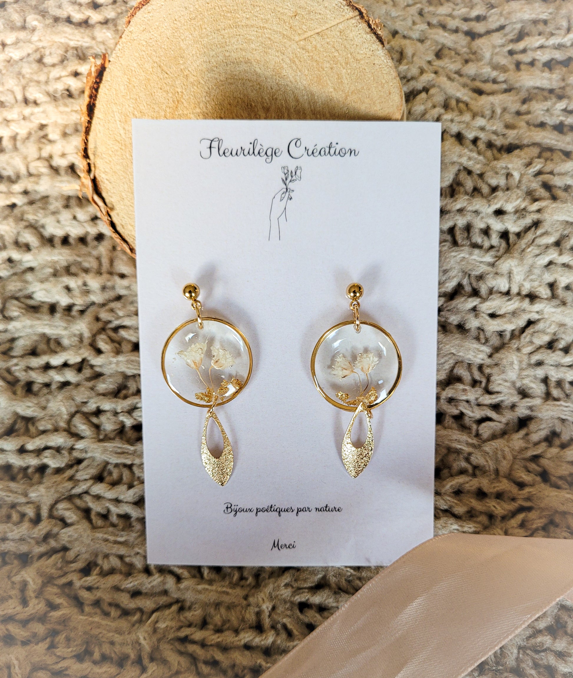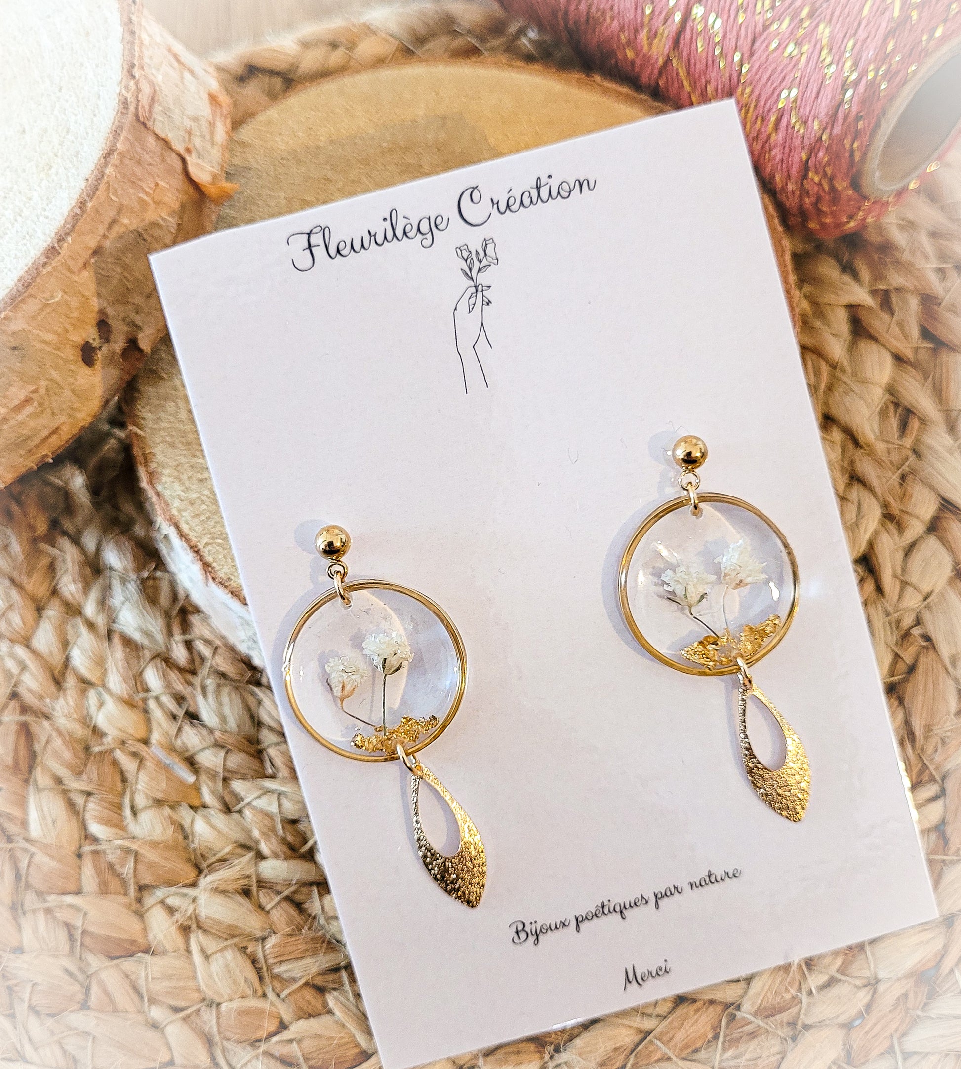 Earrings composed of rings filled with white baby's breath and gold leaf.