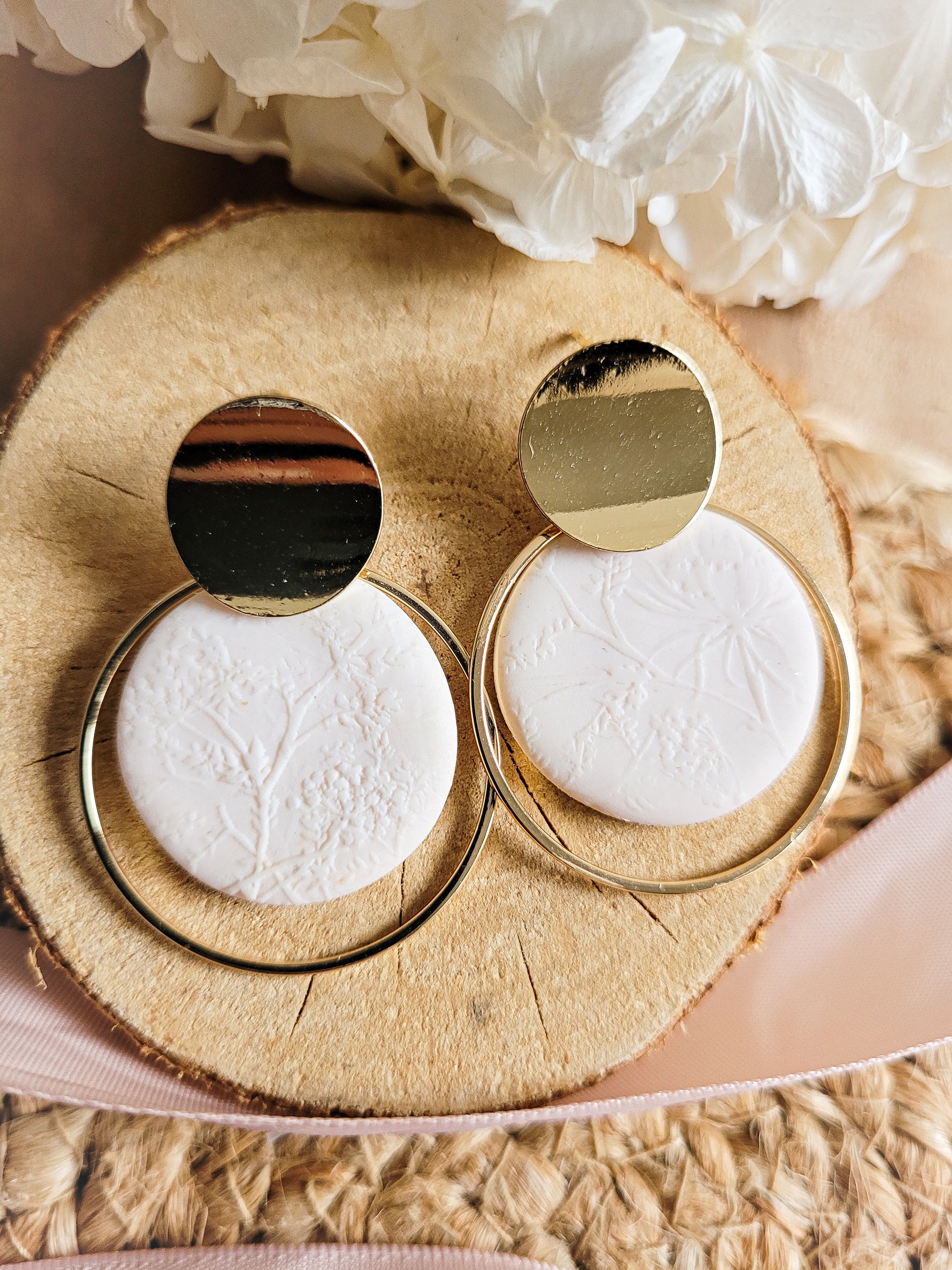 Earrings with rings and circles in polymer clay with floral motifs.