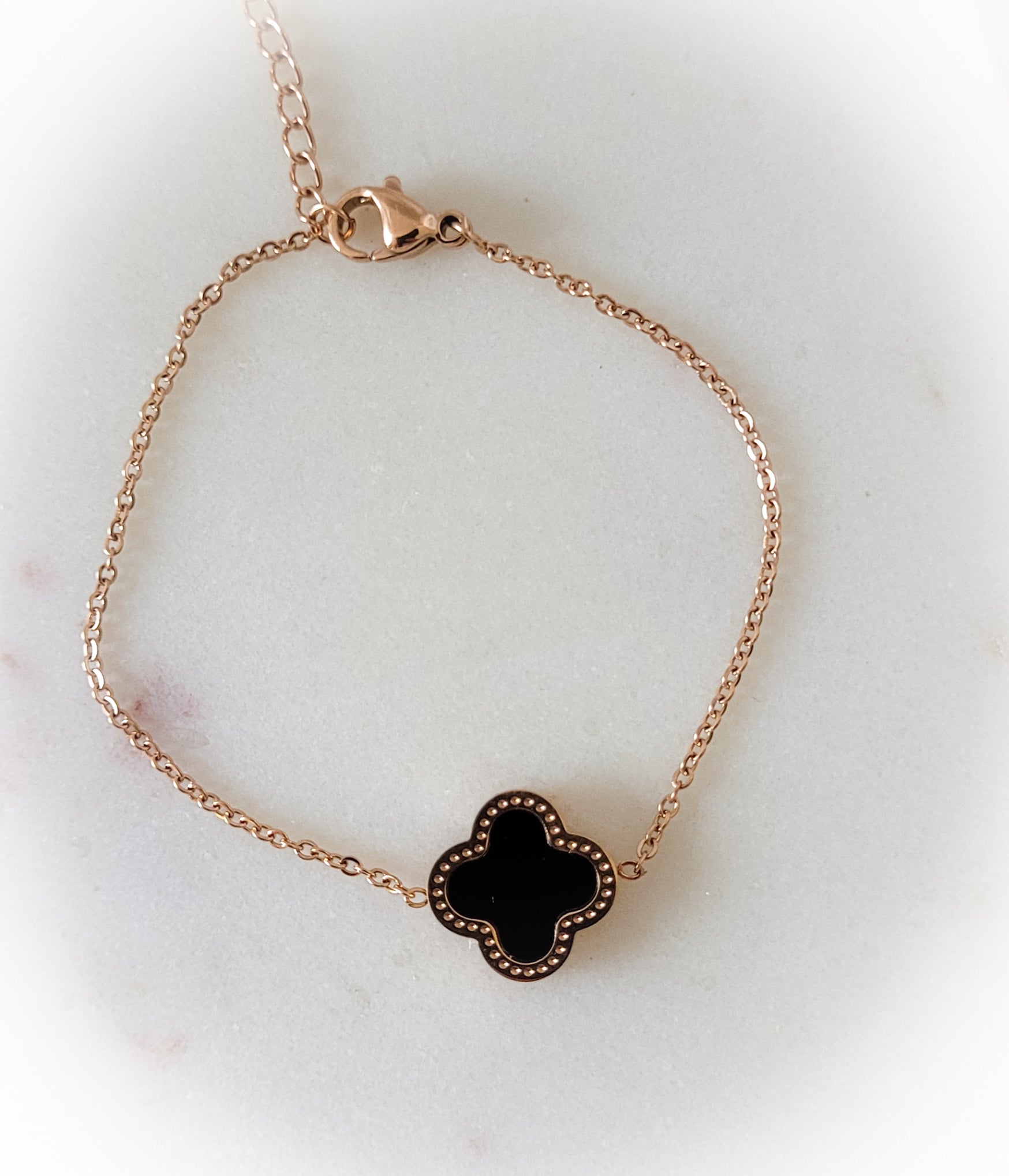 Stainless steel bracelet with clover pendant.