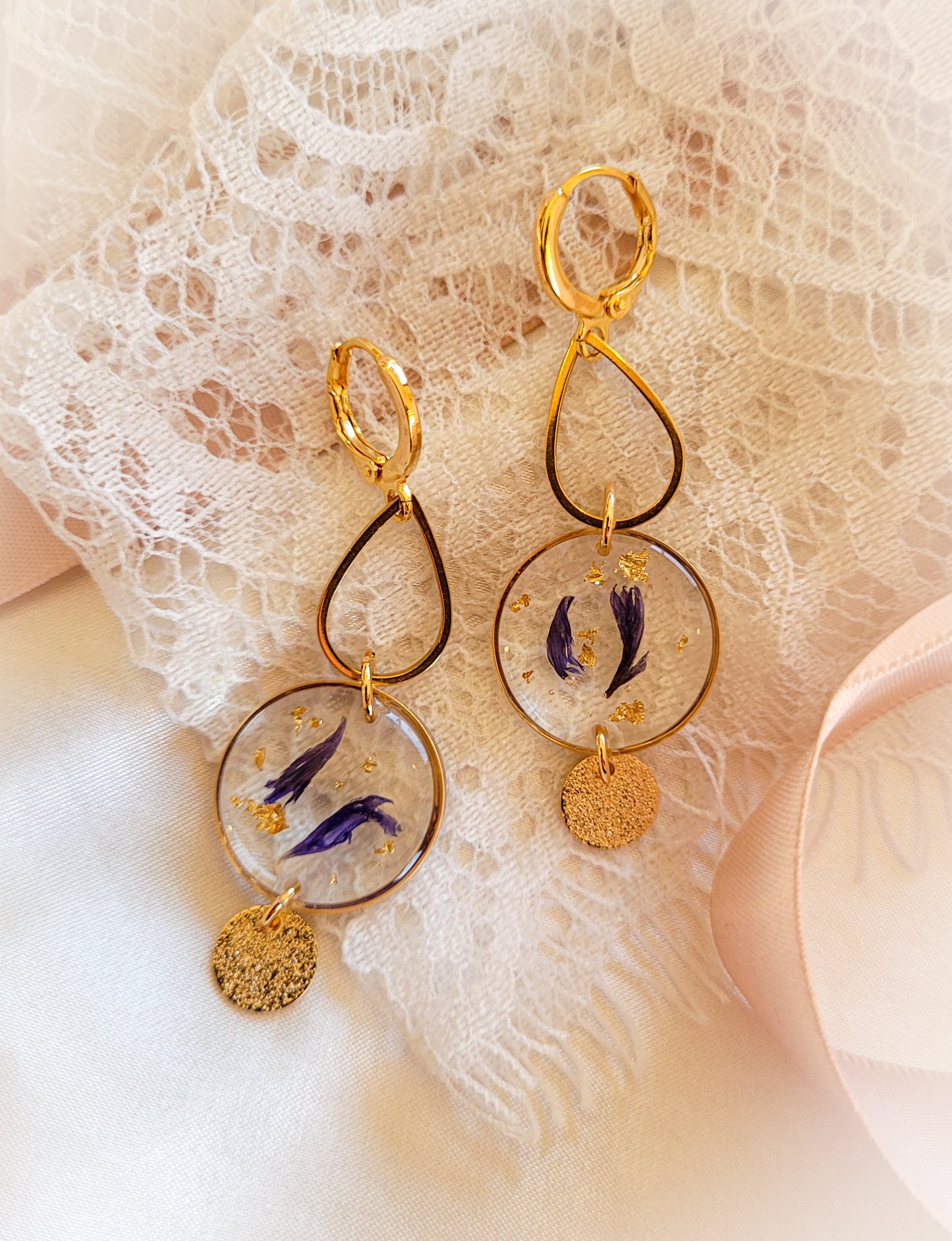 Boucles d'oreilles type dormeuses composées d'un pendentif goutte et anneau rempli de résine dans laquelle sont incrustés des pétales de bleuets.