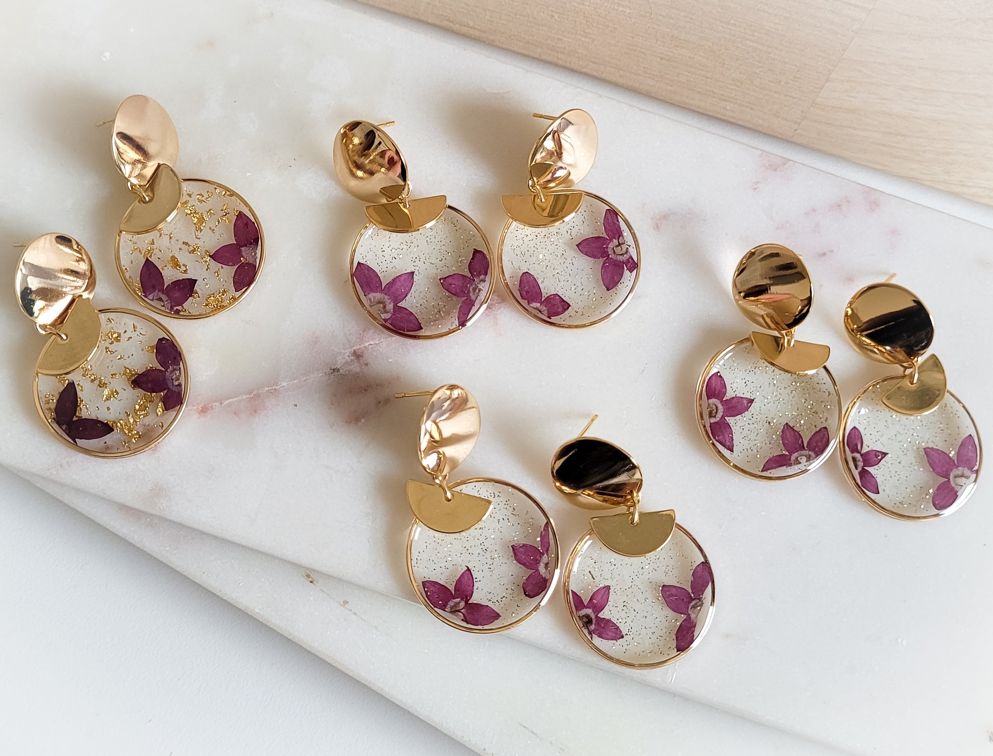 Jolie paire fleurie avec inclusion de fleur "étoile egyptienne" et de fines paillettes.