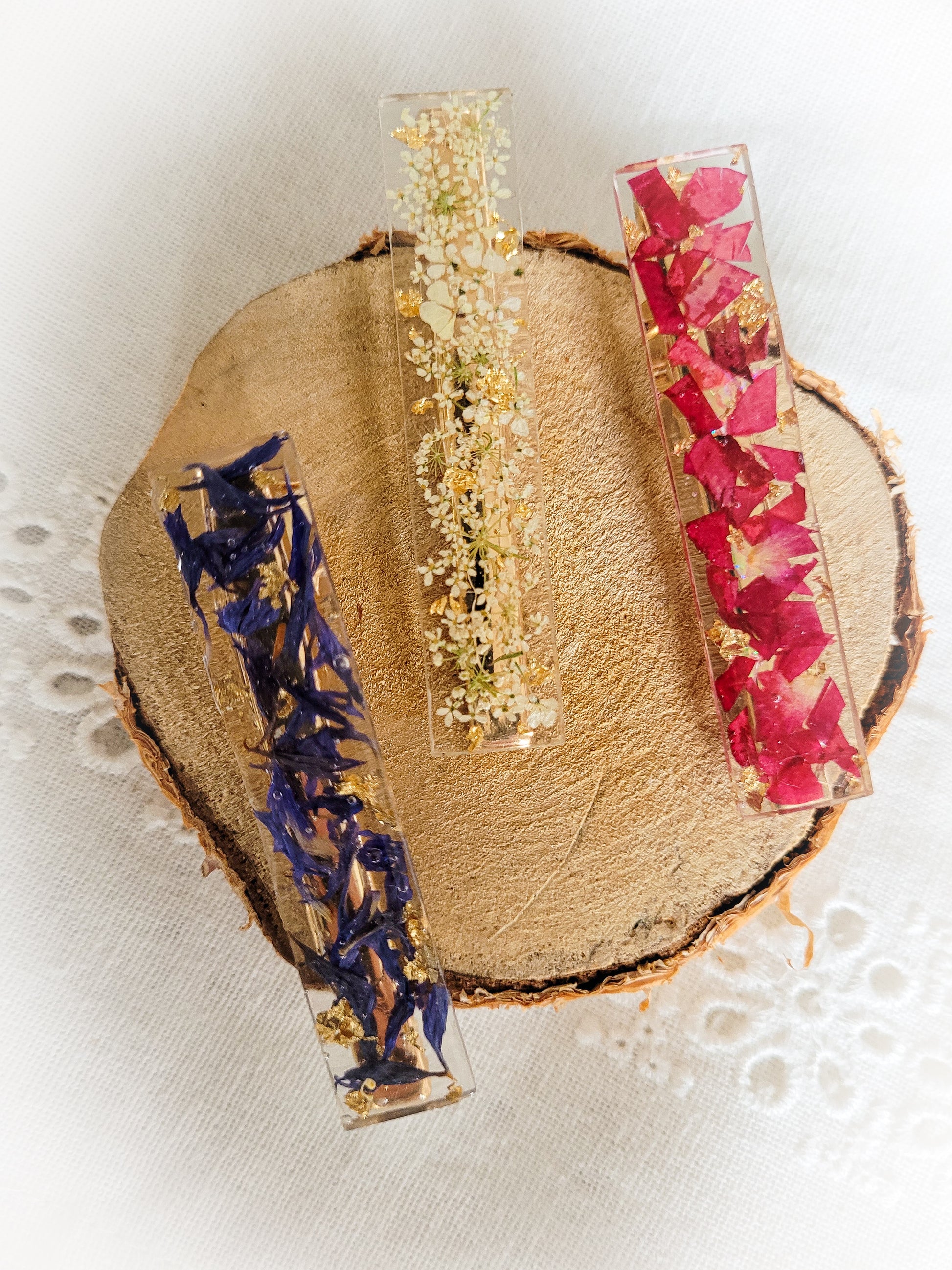 Nos barrettes sont créées à la main. Toutes uniques et ornées d'inclusions de fleurs séchées dans la résine.