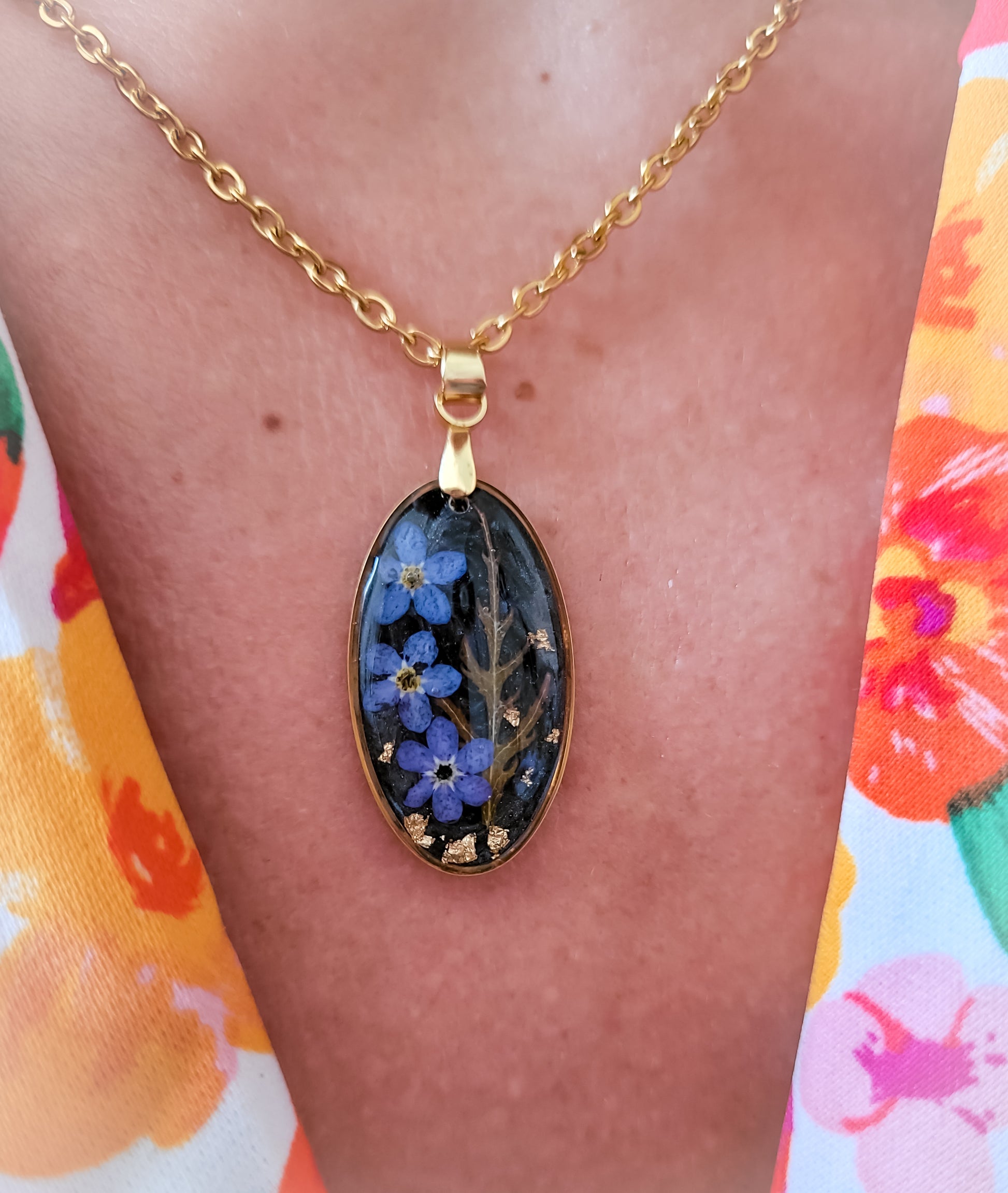 Pendentif inclusion de myosotis et fougères rouge sur un fond noir irisé.