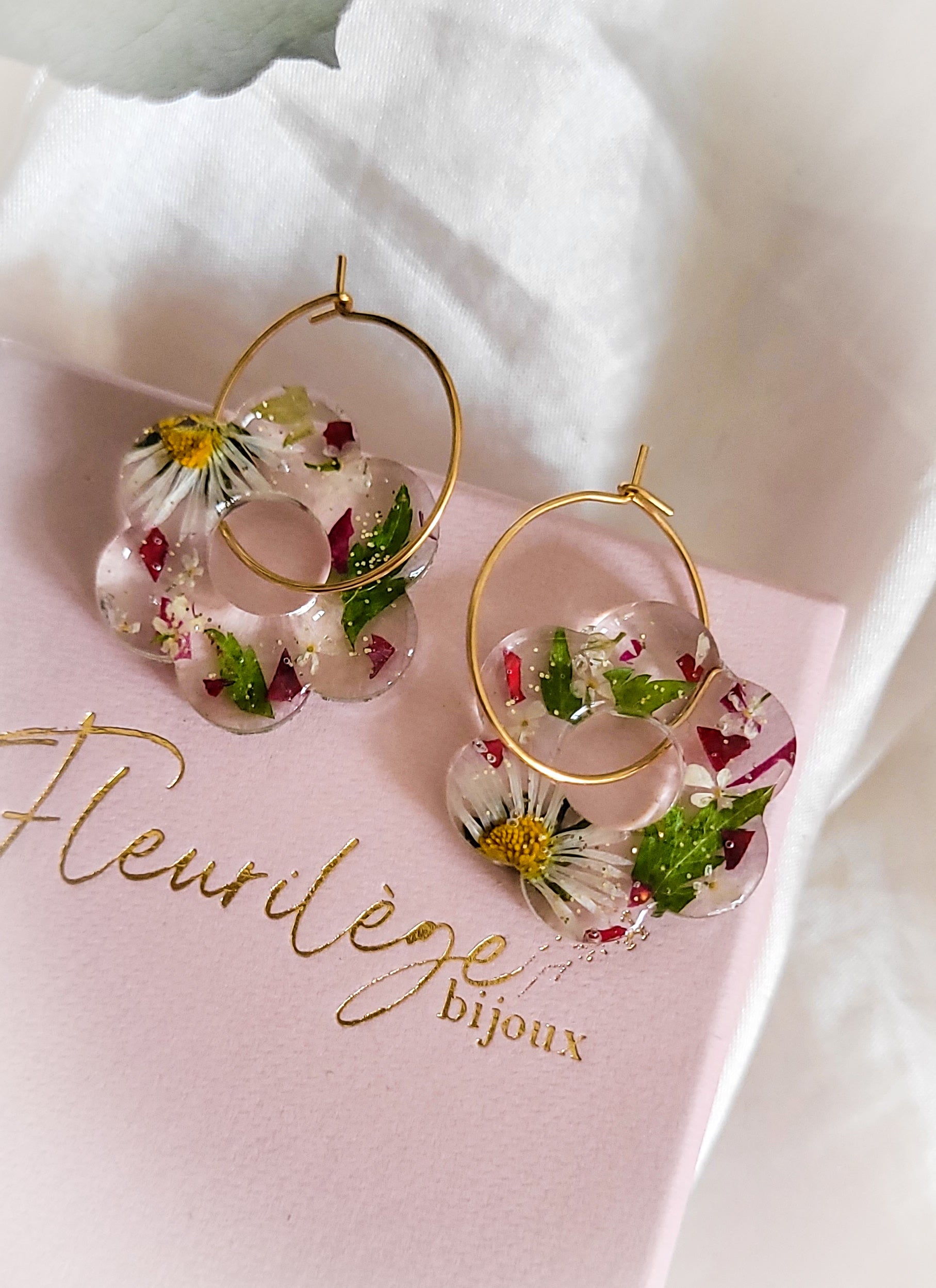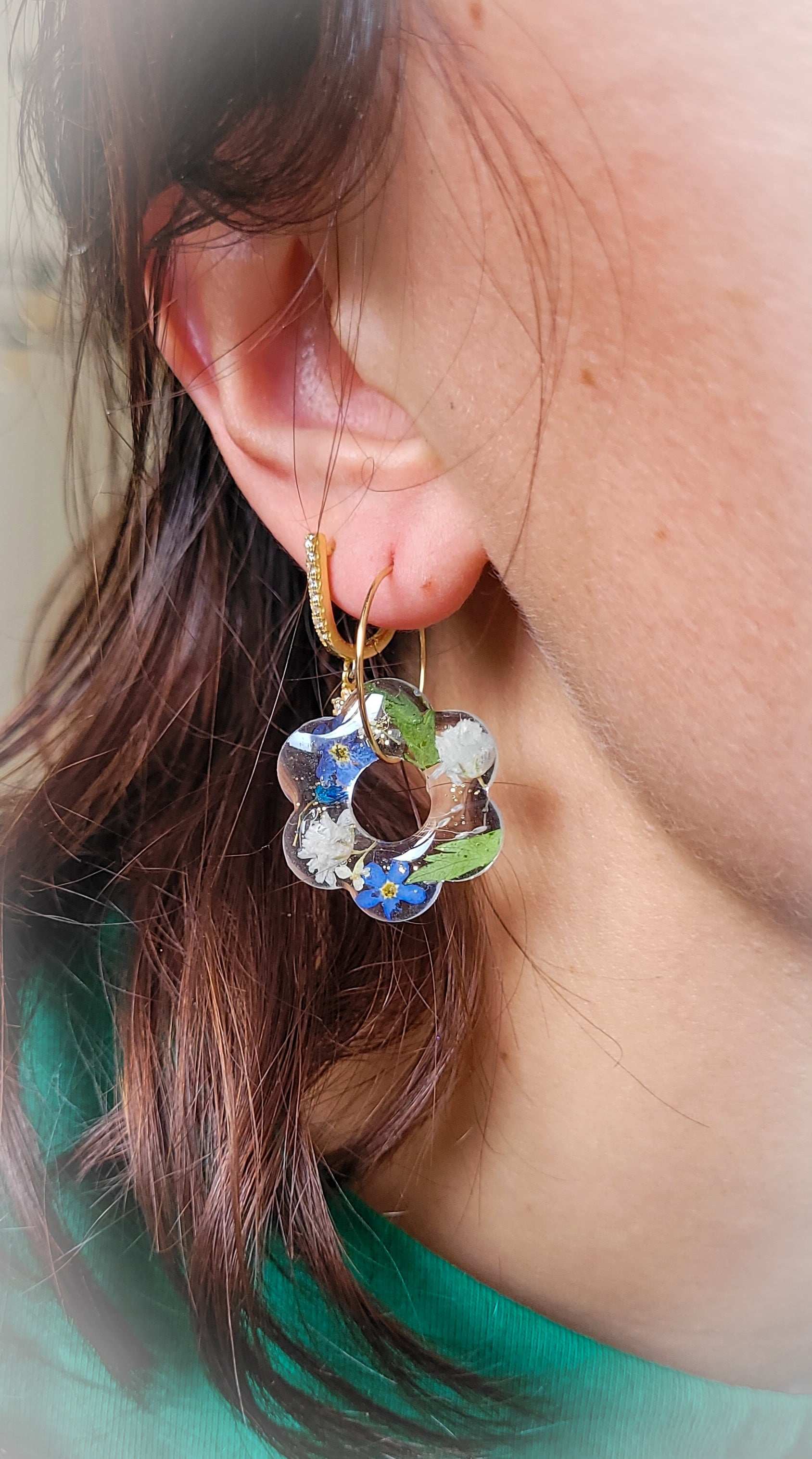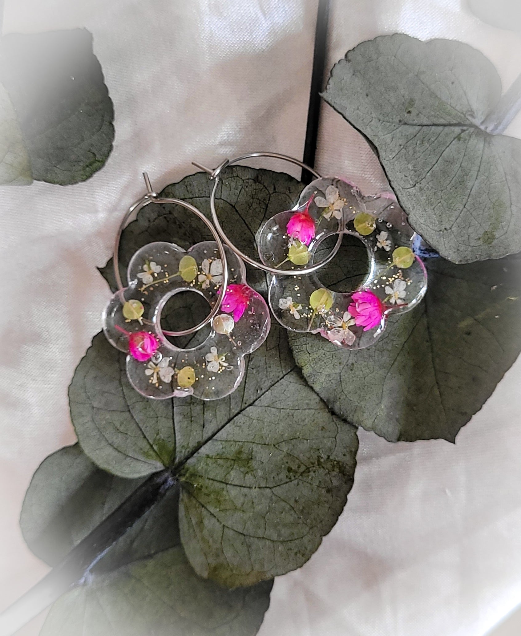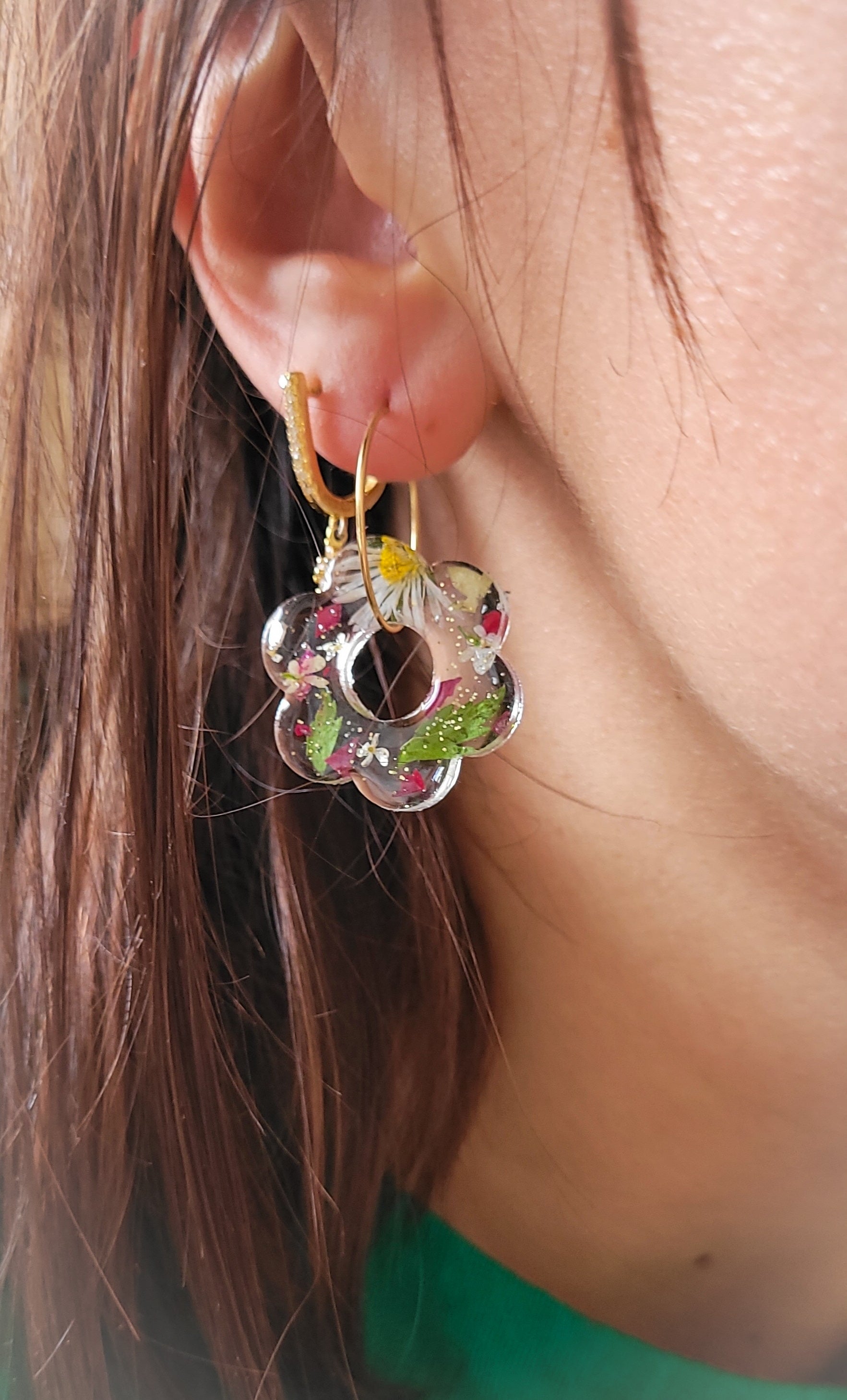 Créoles avec pendentif en forme de fleurs et inclusion de fleurs séchées.