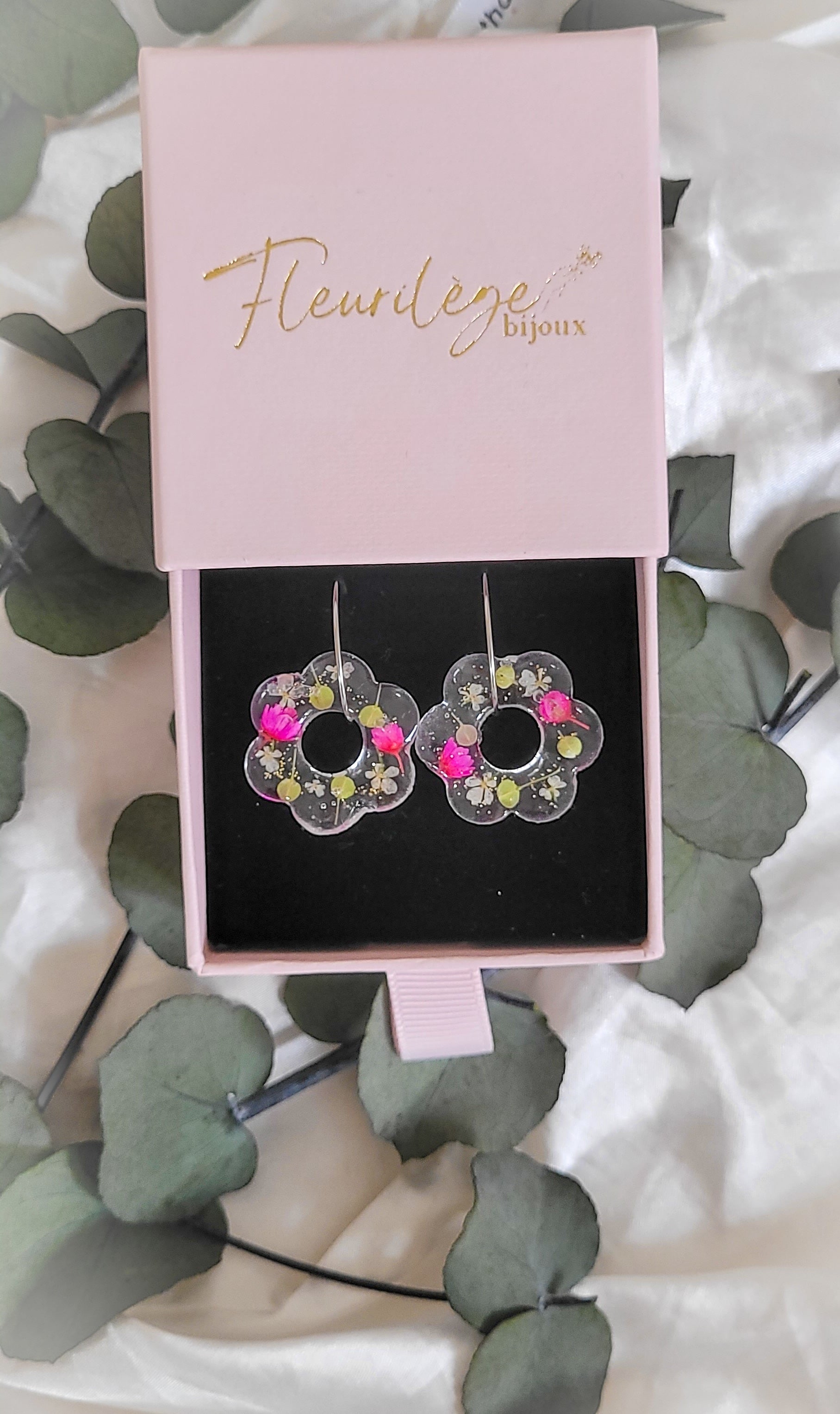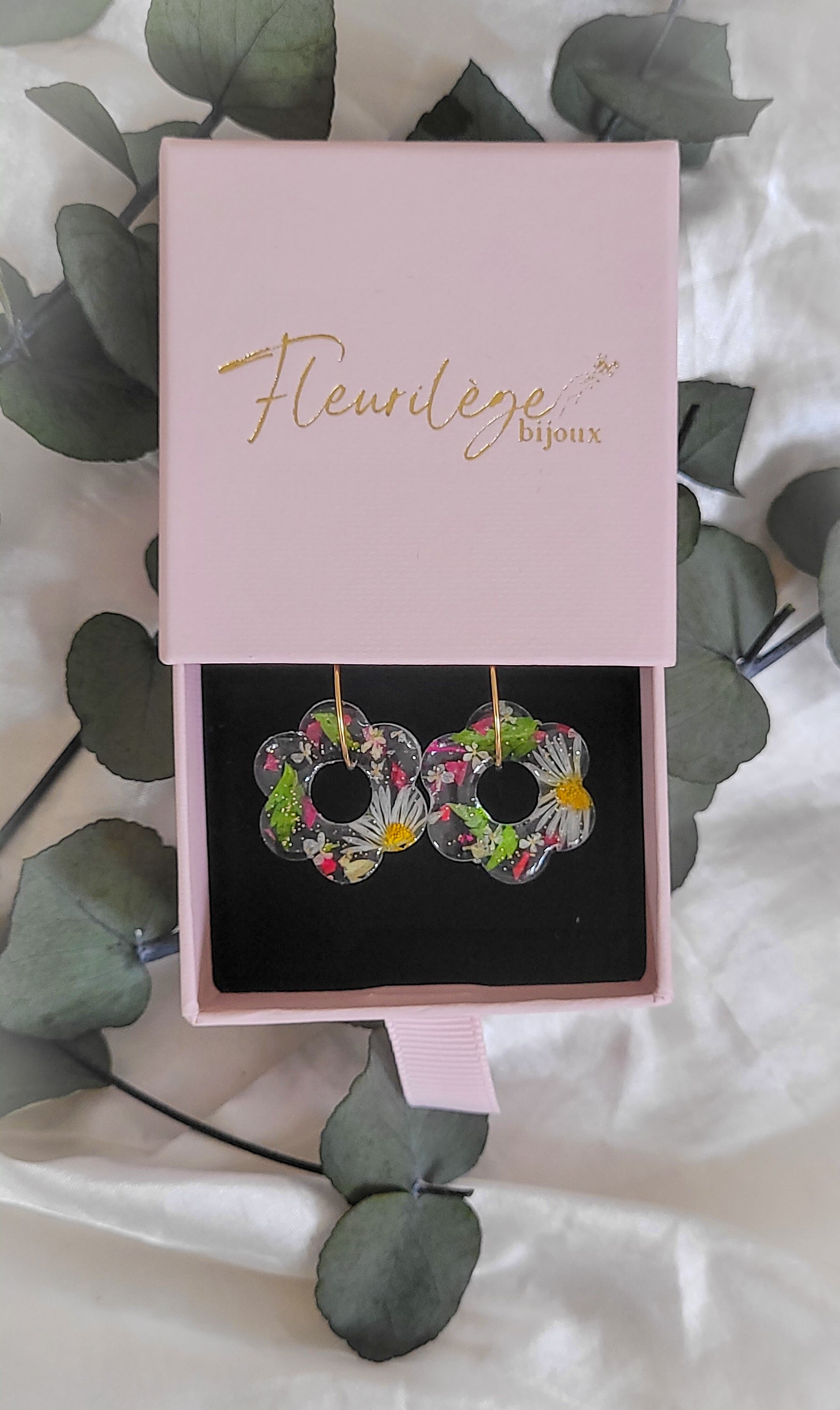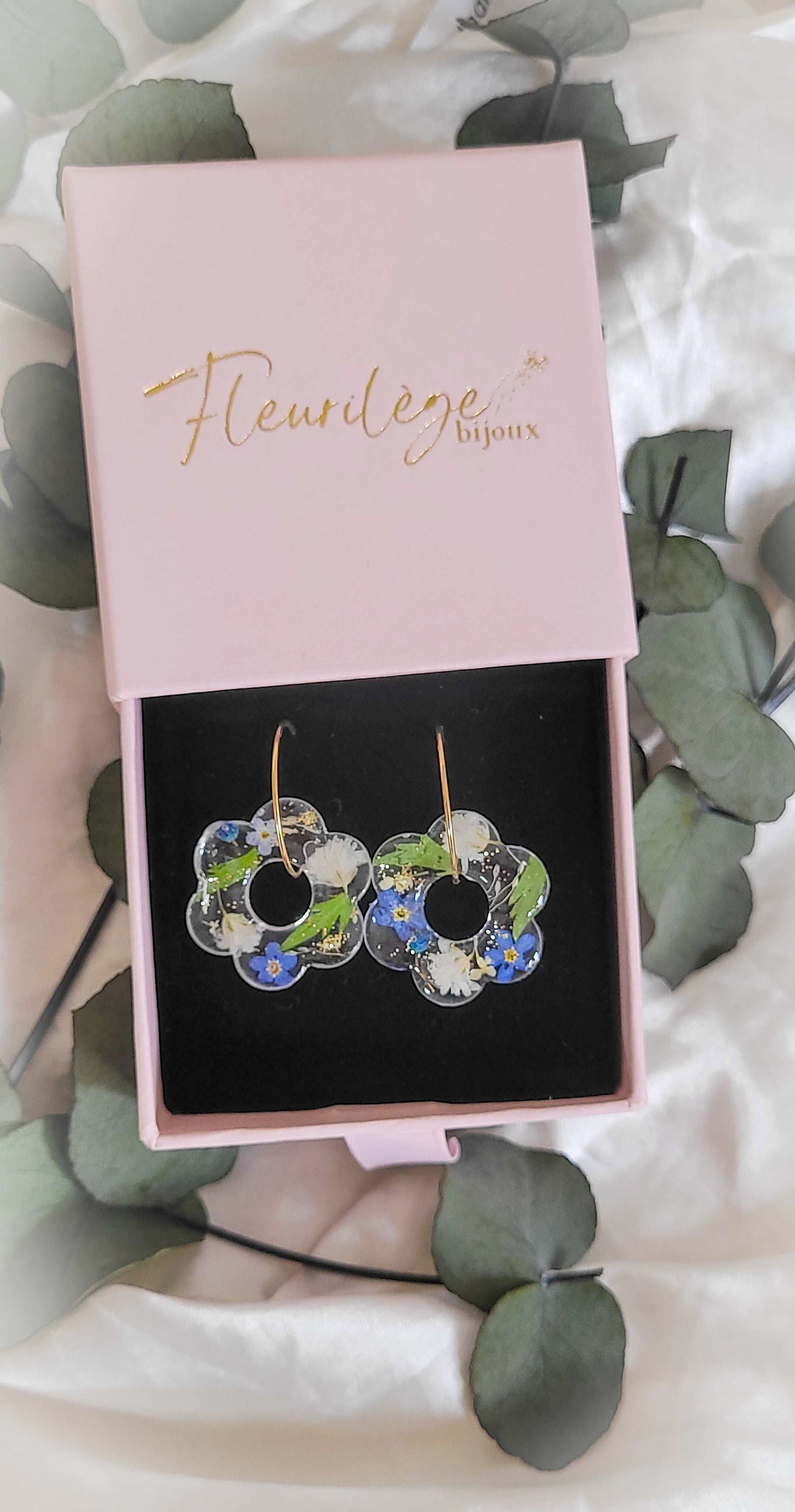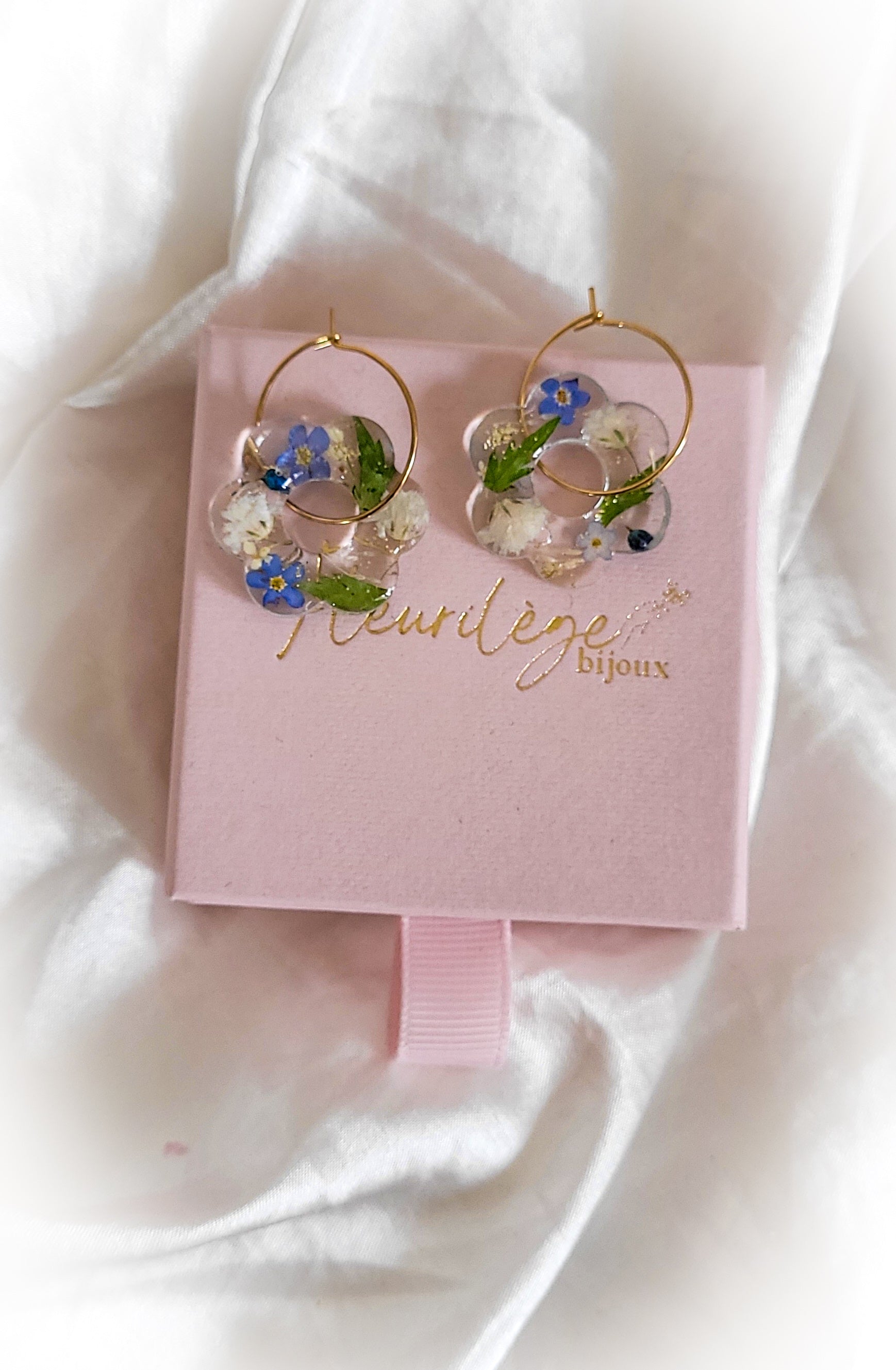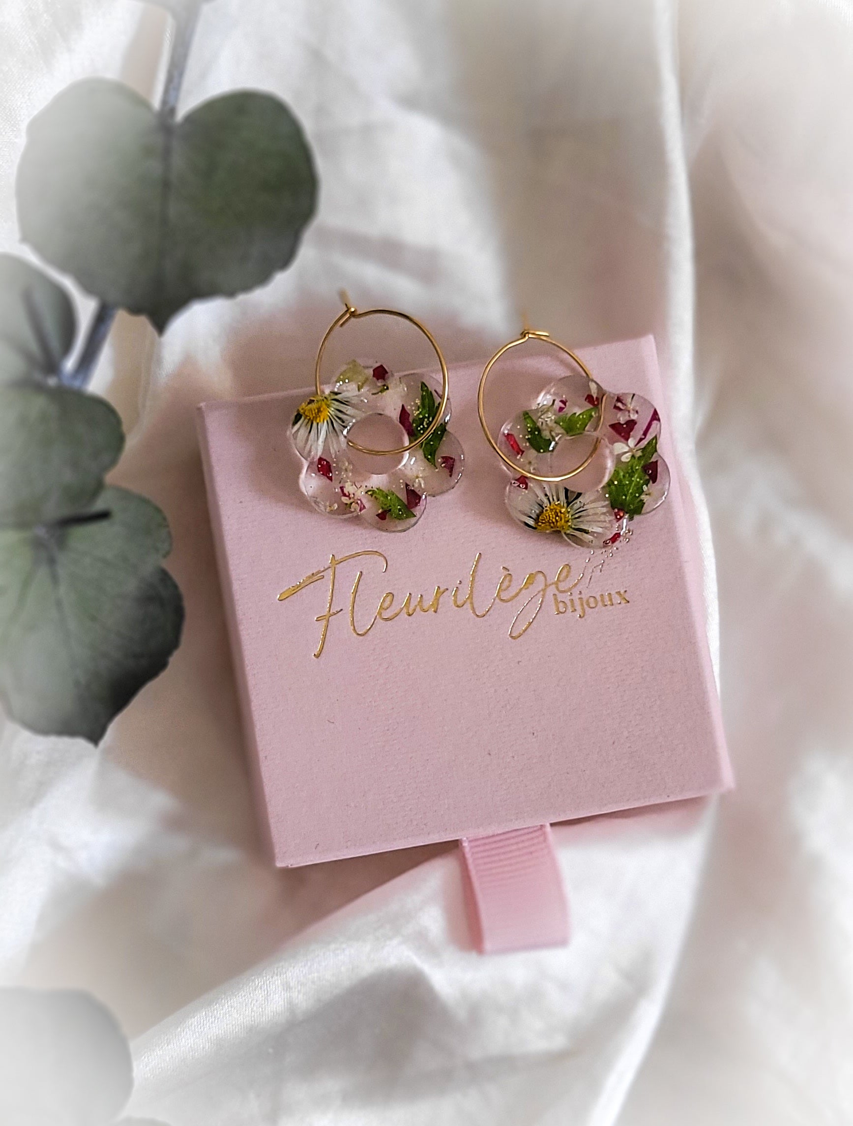 Créoles avec pendentif en forme de fleurs et inclusion de fleurs séchées.