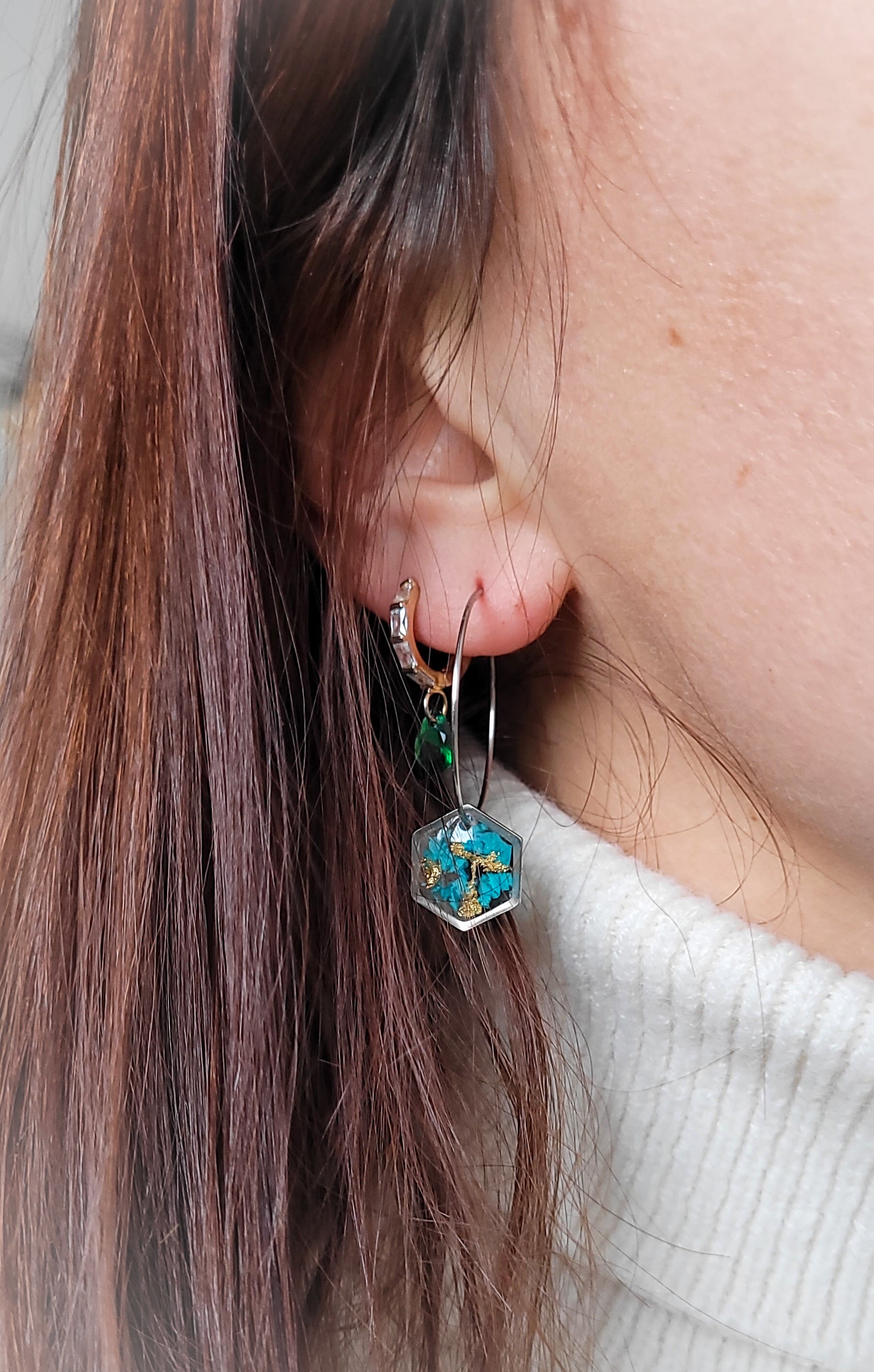 Créoles avec inclusion de pétales d'hortensia bleu et de paillettes d'or.