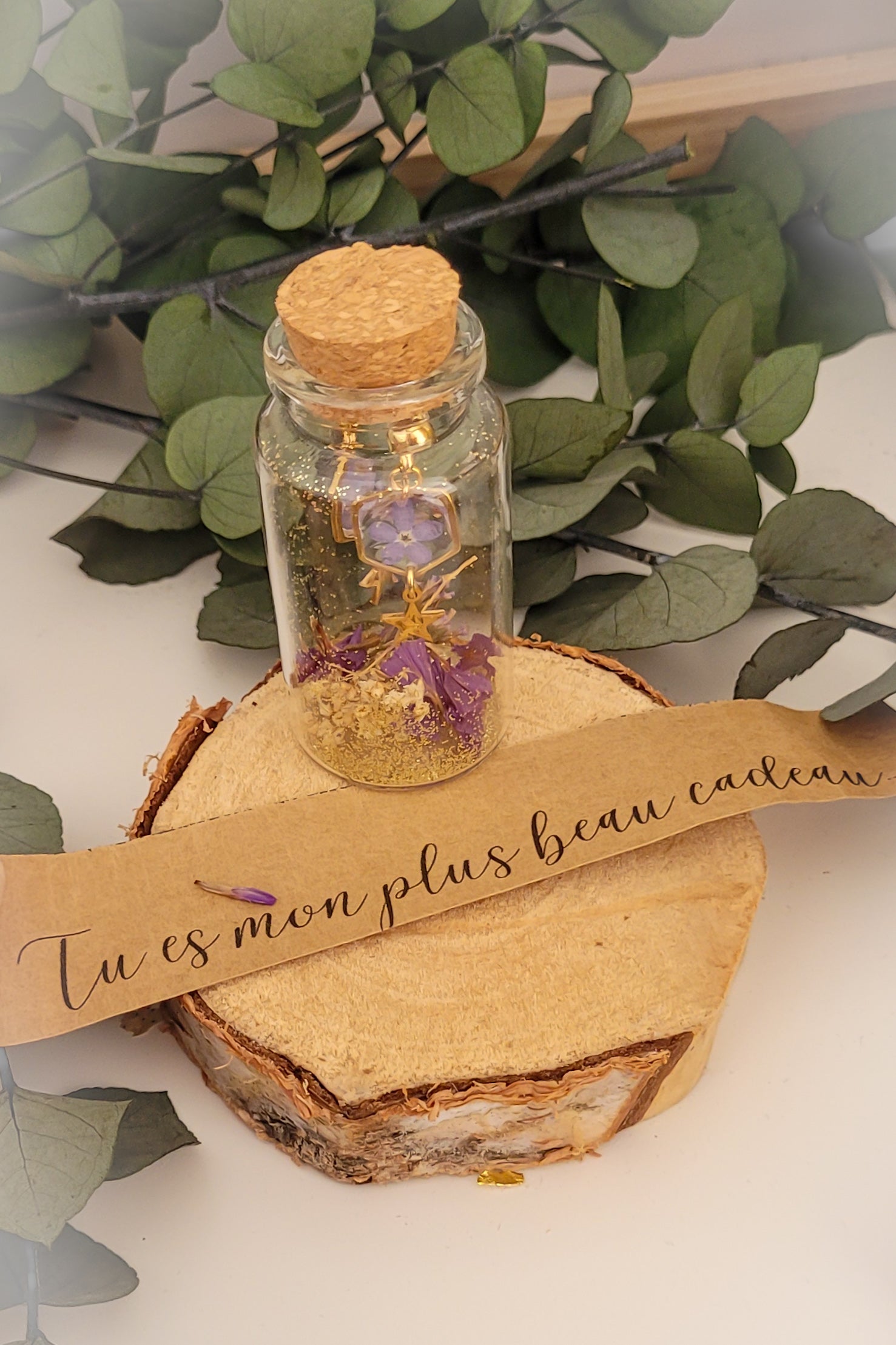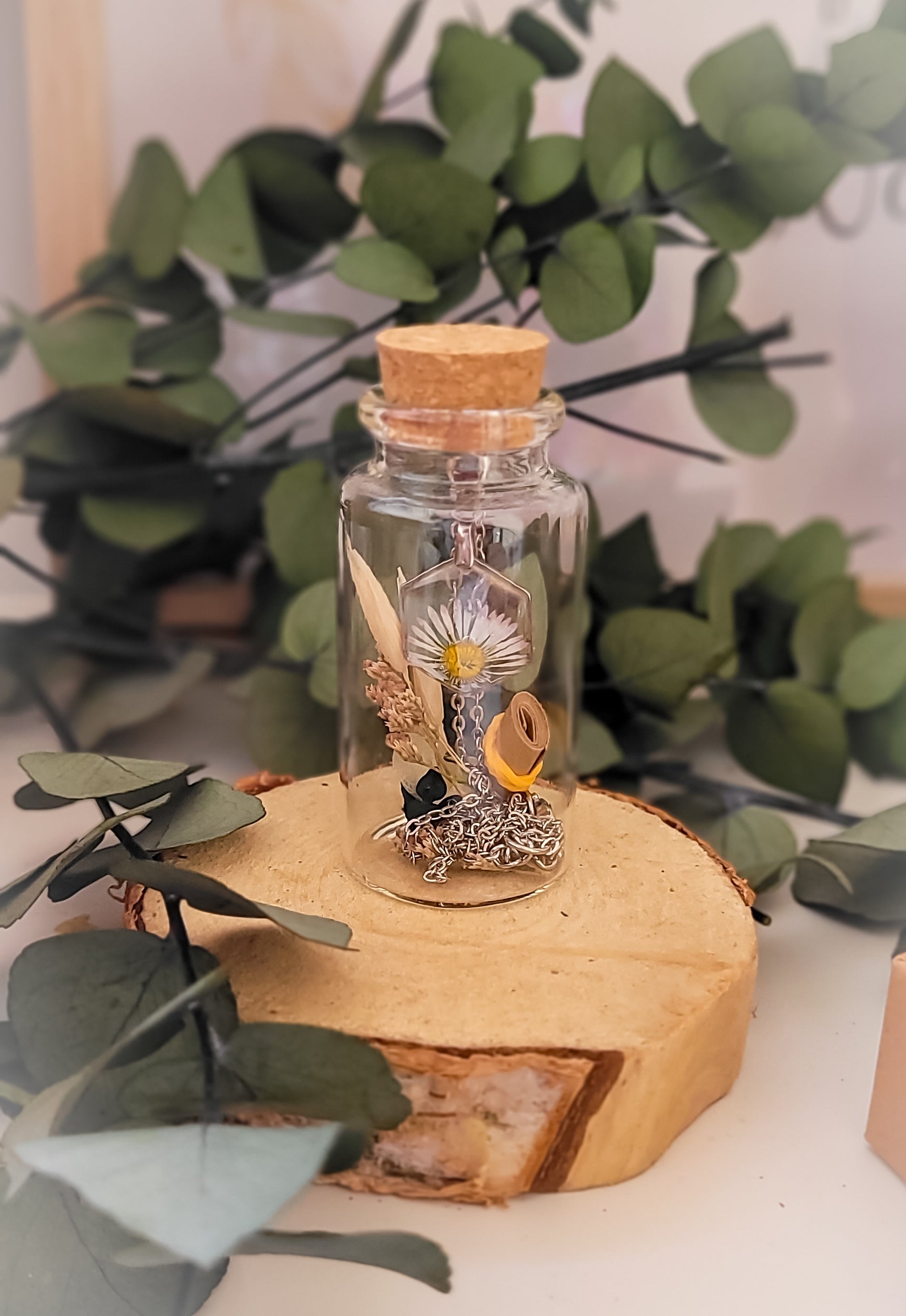 Une fiole en verre où votre bijou sera accroché avec des fleurs séchées, un message d'amour, ou inspirant glissé à l'intérieur, au hasard inspirés des biscuits chinois (fortune cookie).