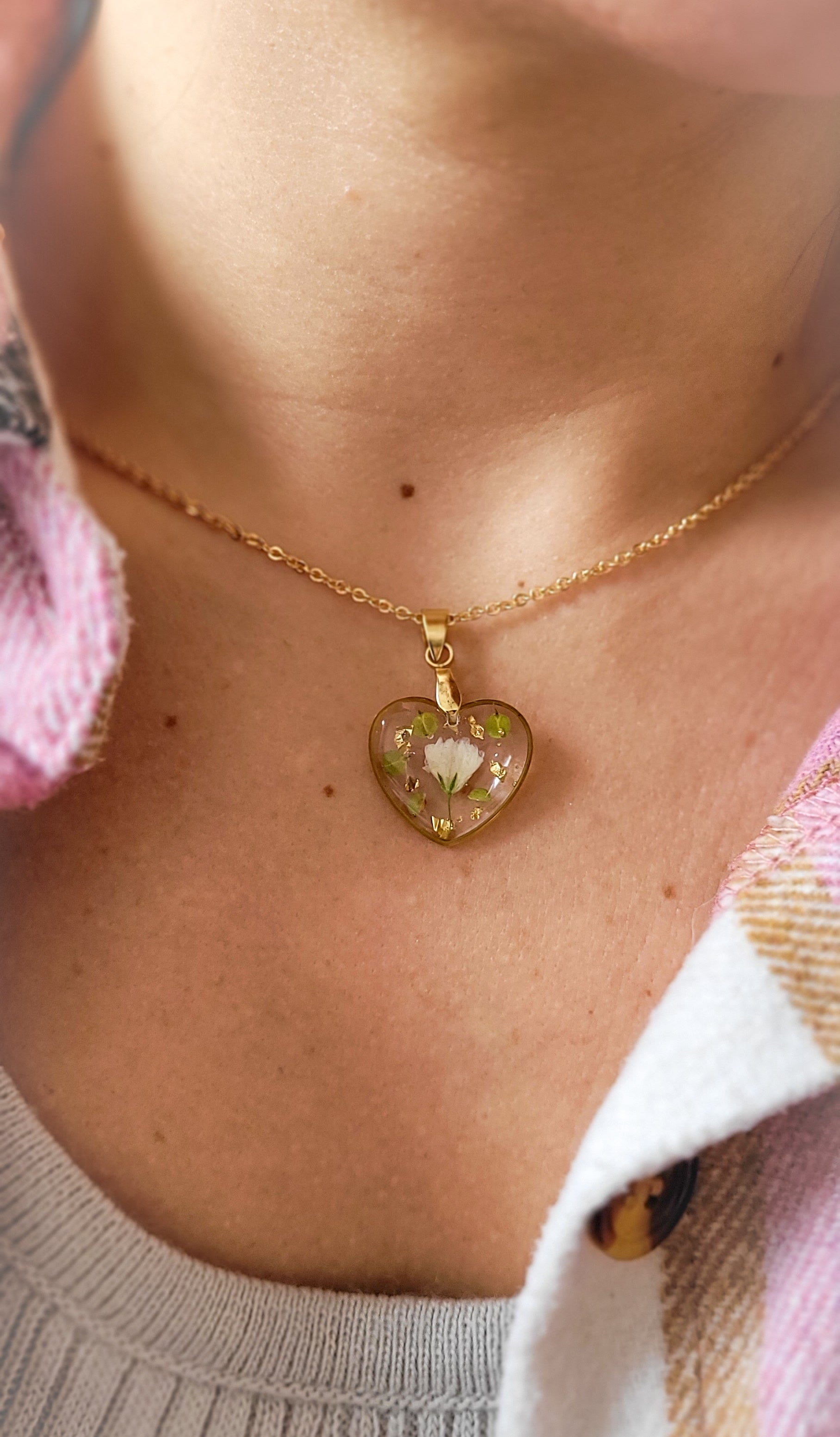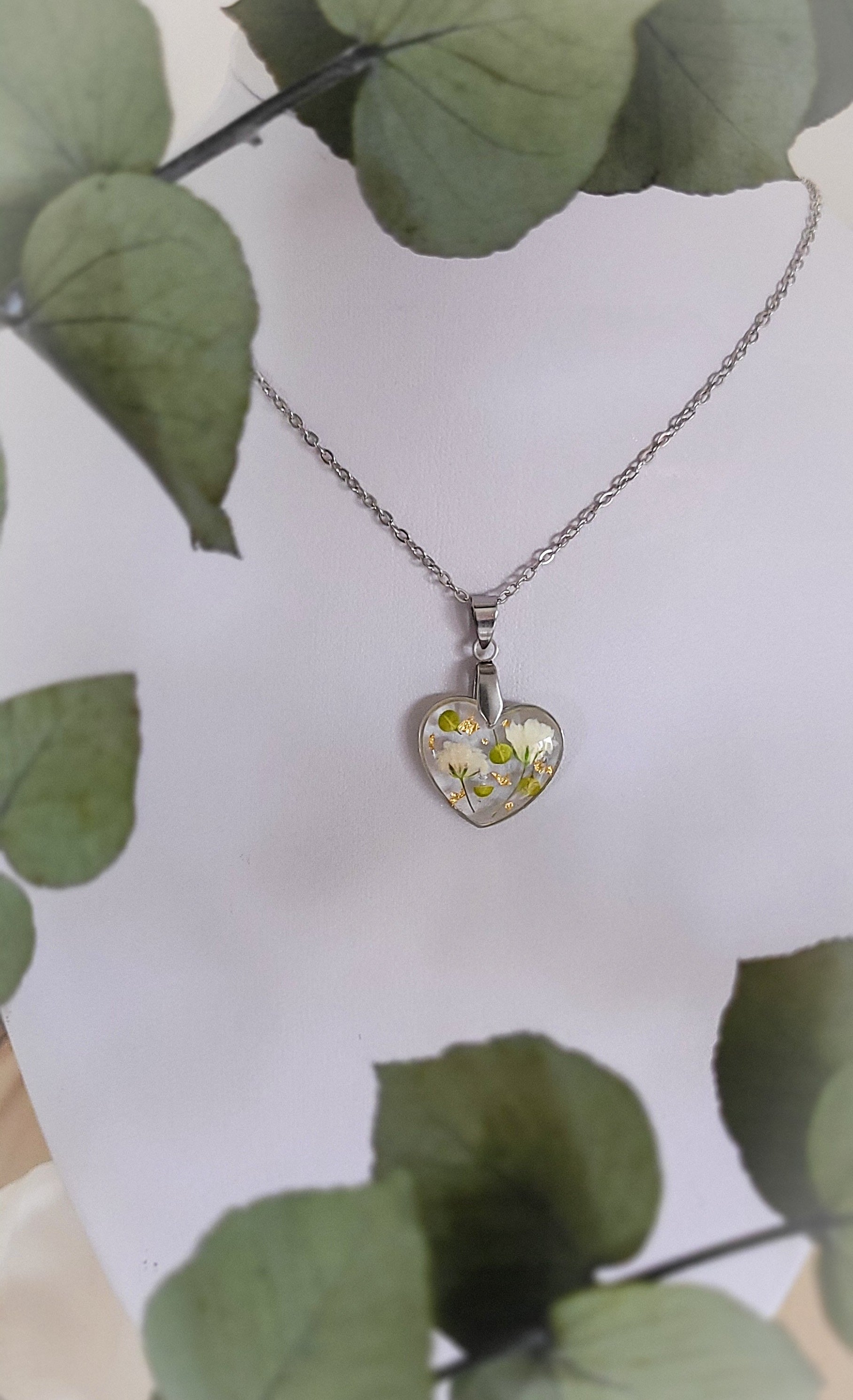 Pendentif cœur avec inclusion de gypsophile et végétaux.